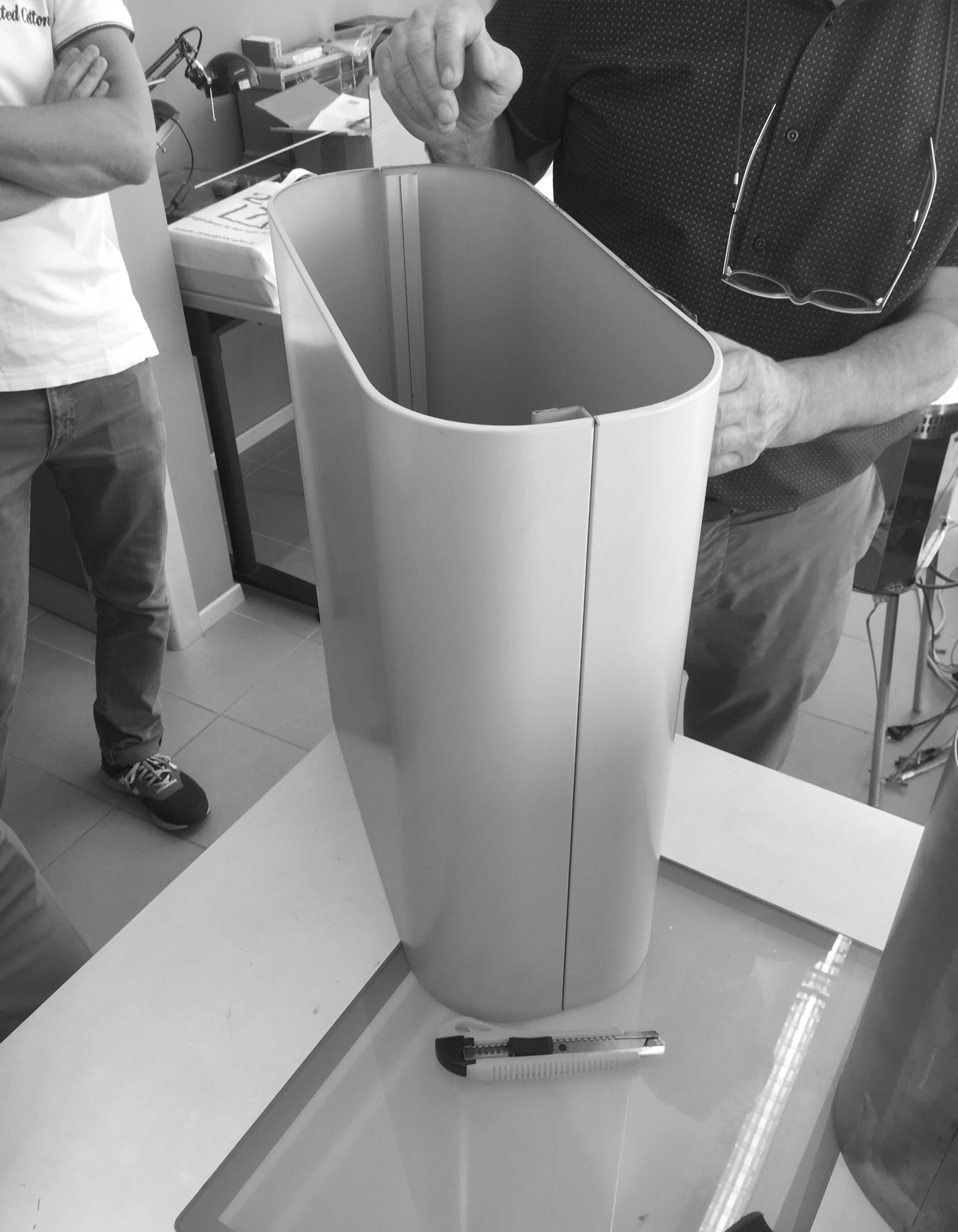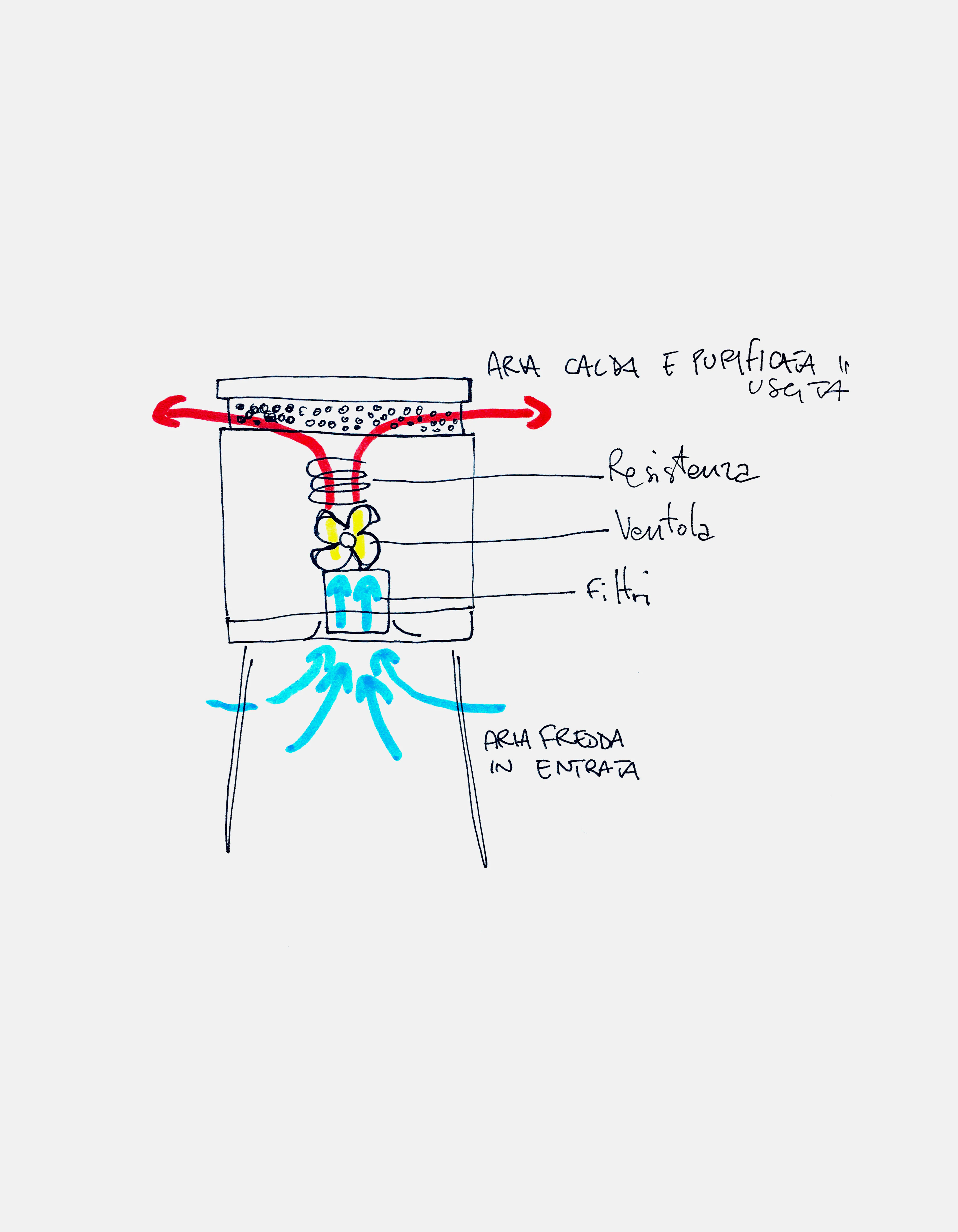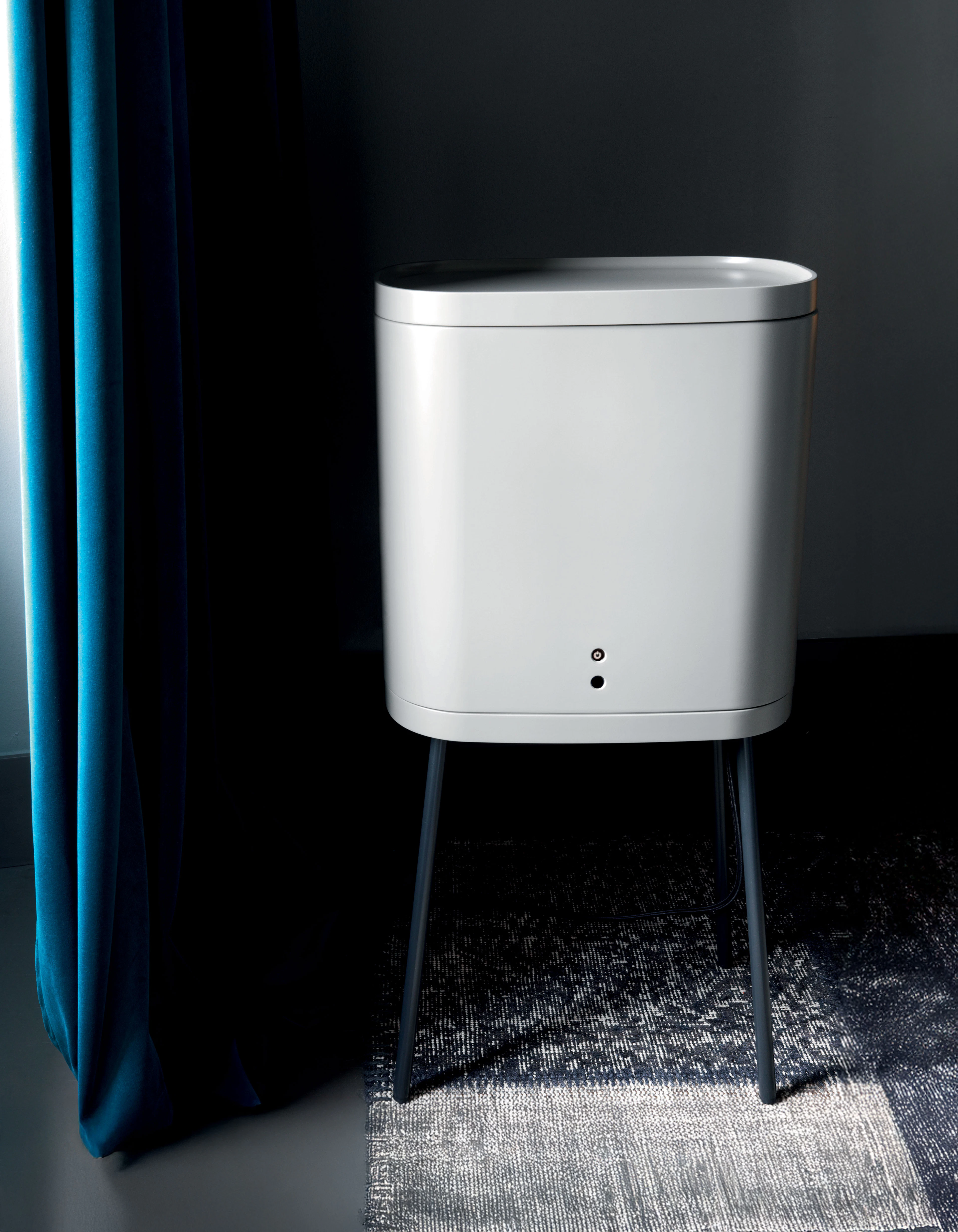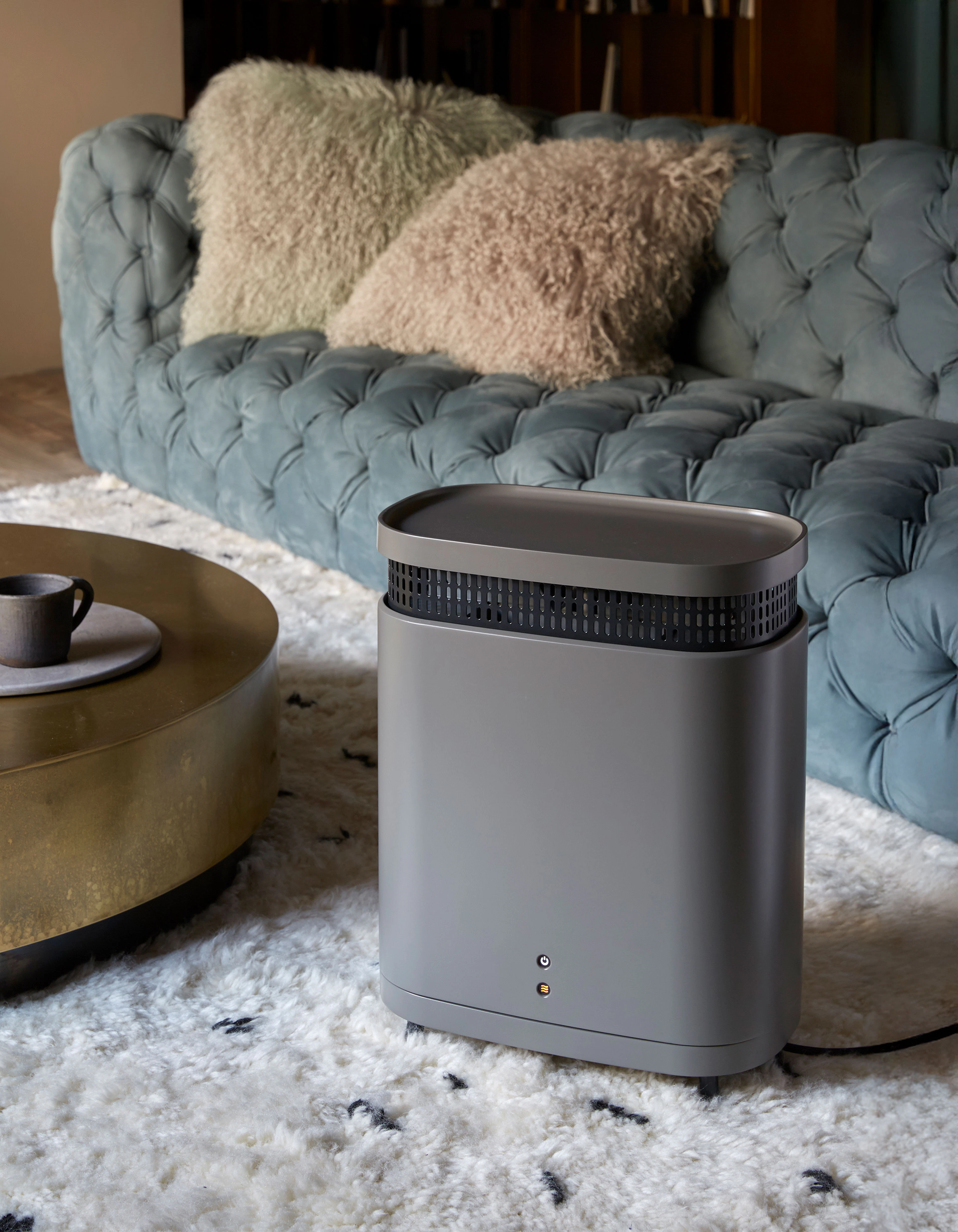 A polyurethane shell encloses a high-performance heating element and active carbon F7 filter that removes odours, pollen, mould, and bacteria. Complete thermal insulation keeps the surface cool to the touch. Touch-sensitive controls and Bluetooth connectivity enable adjustments through a dedicated app, merging digital convenience with tactile interaction in seamless harmony.