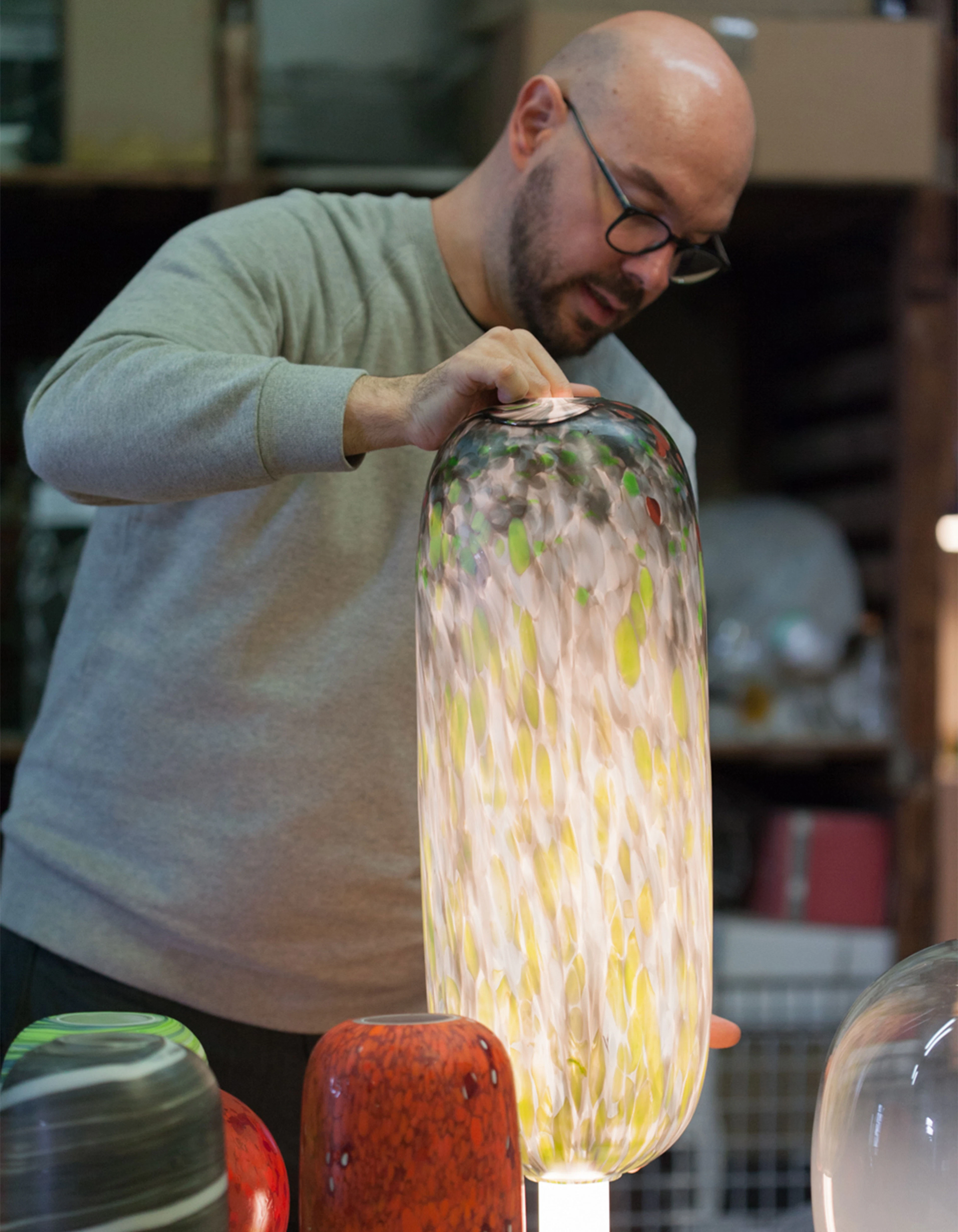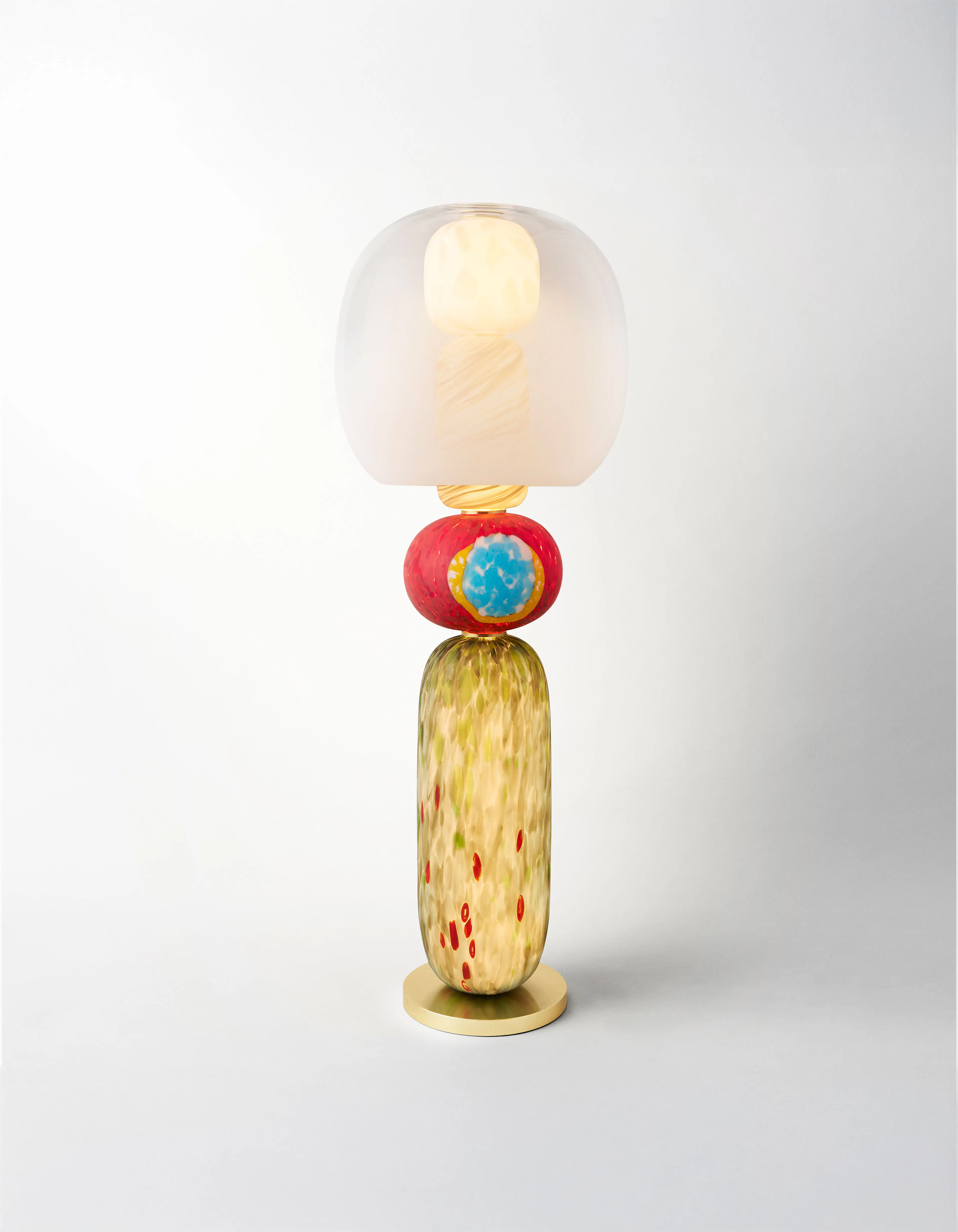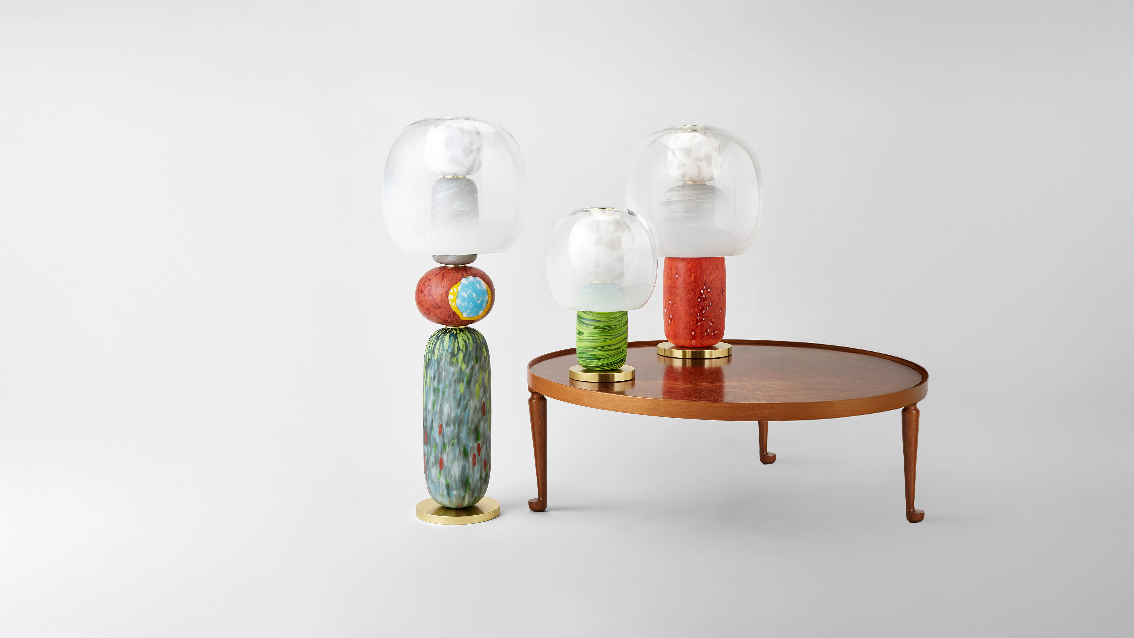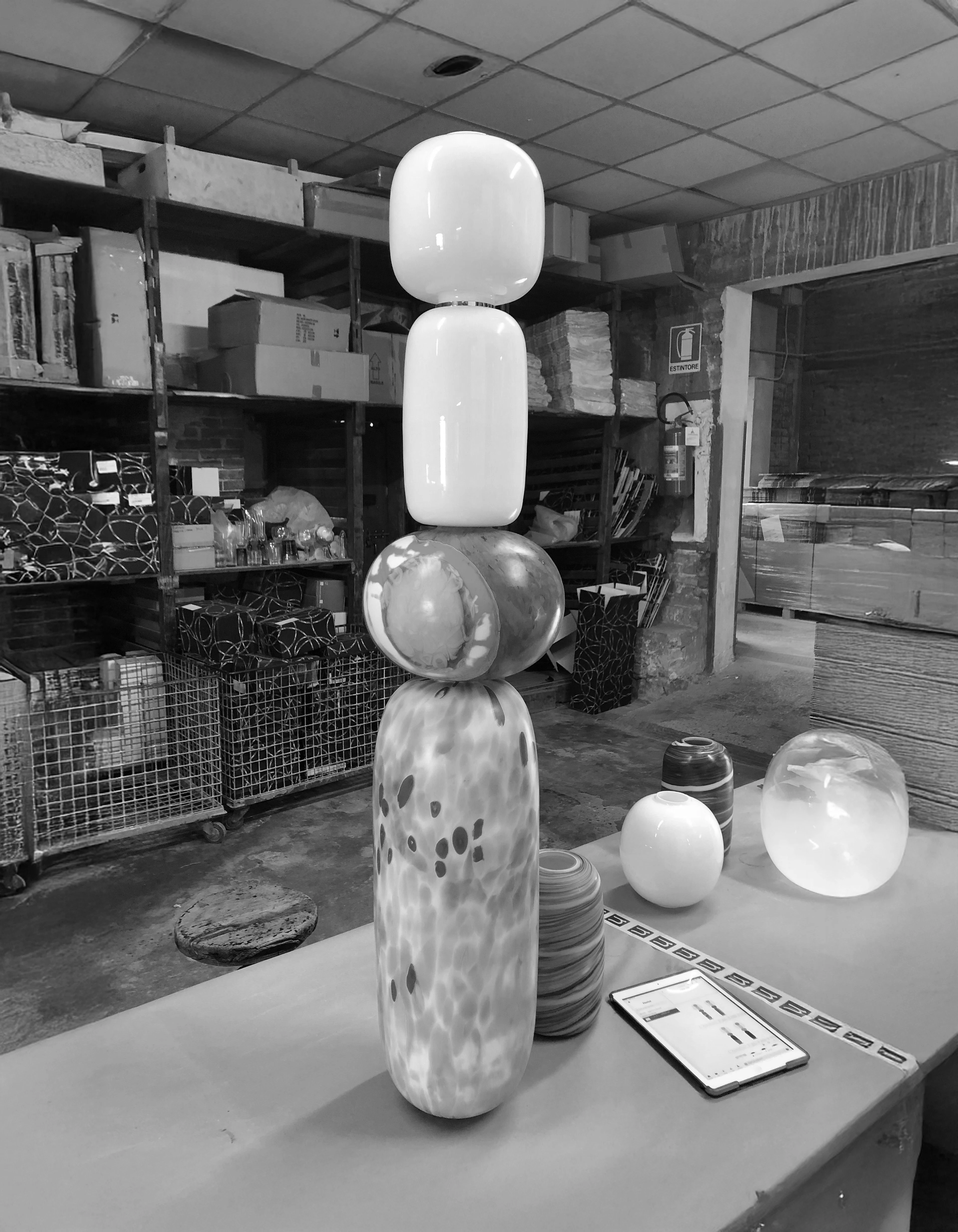 Below, a vertical sequence of Murano pebbles builds a totemic presence.