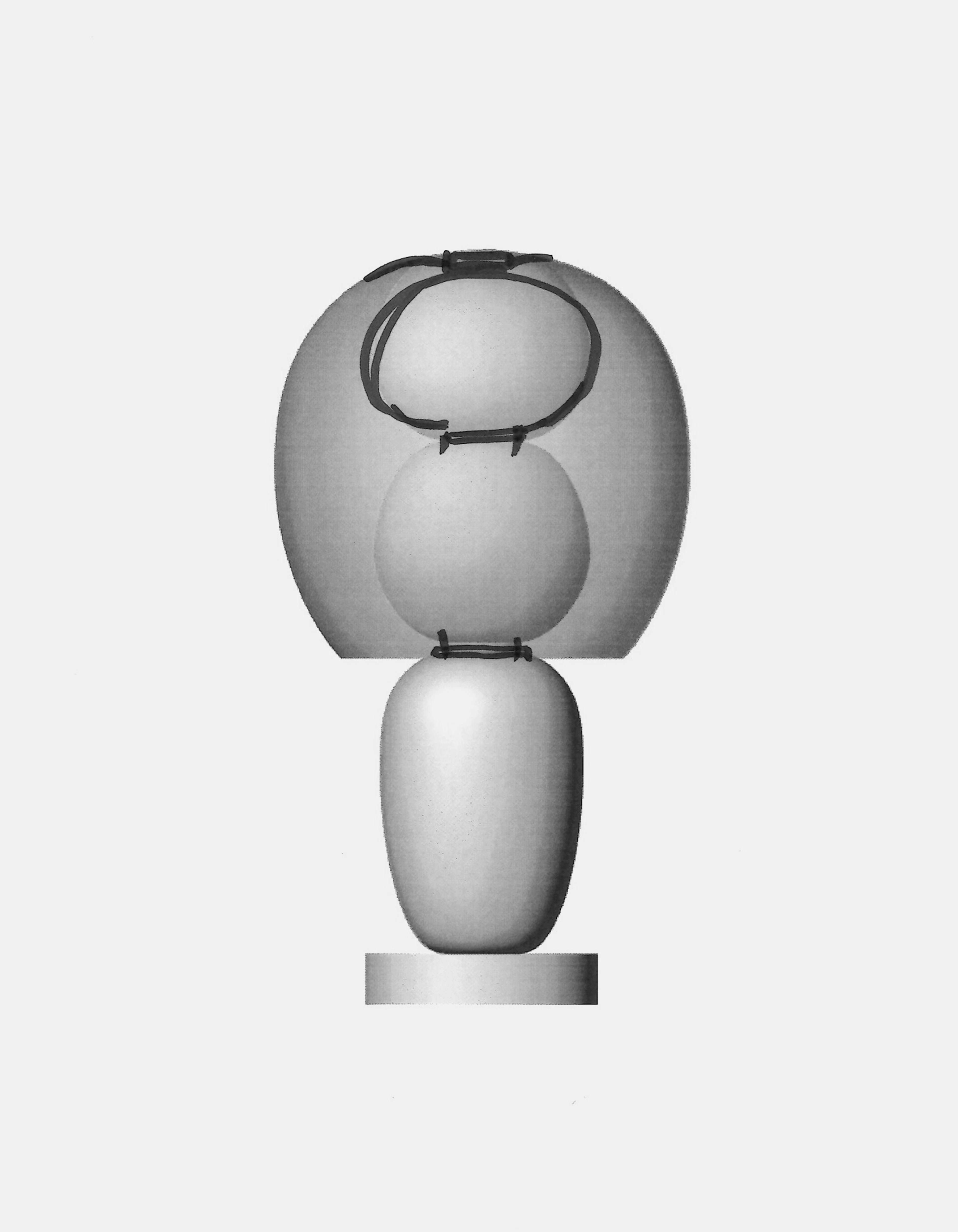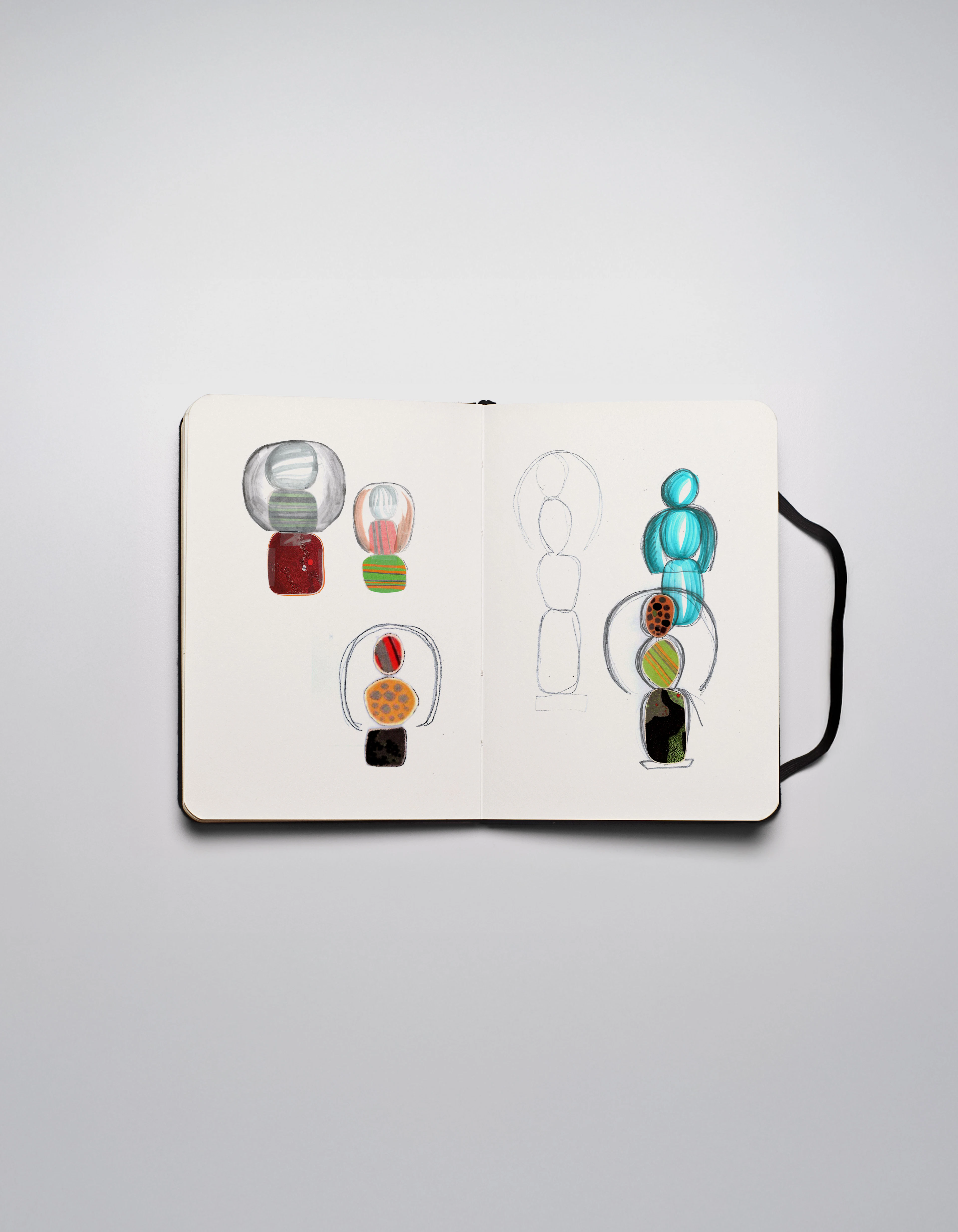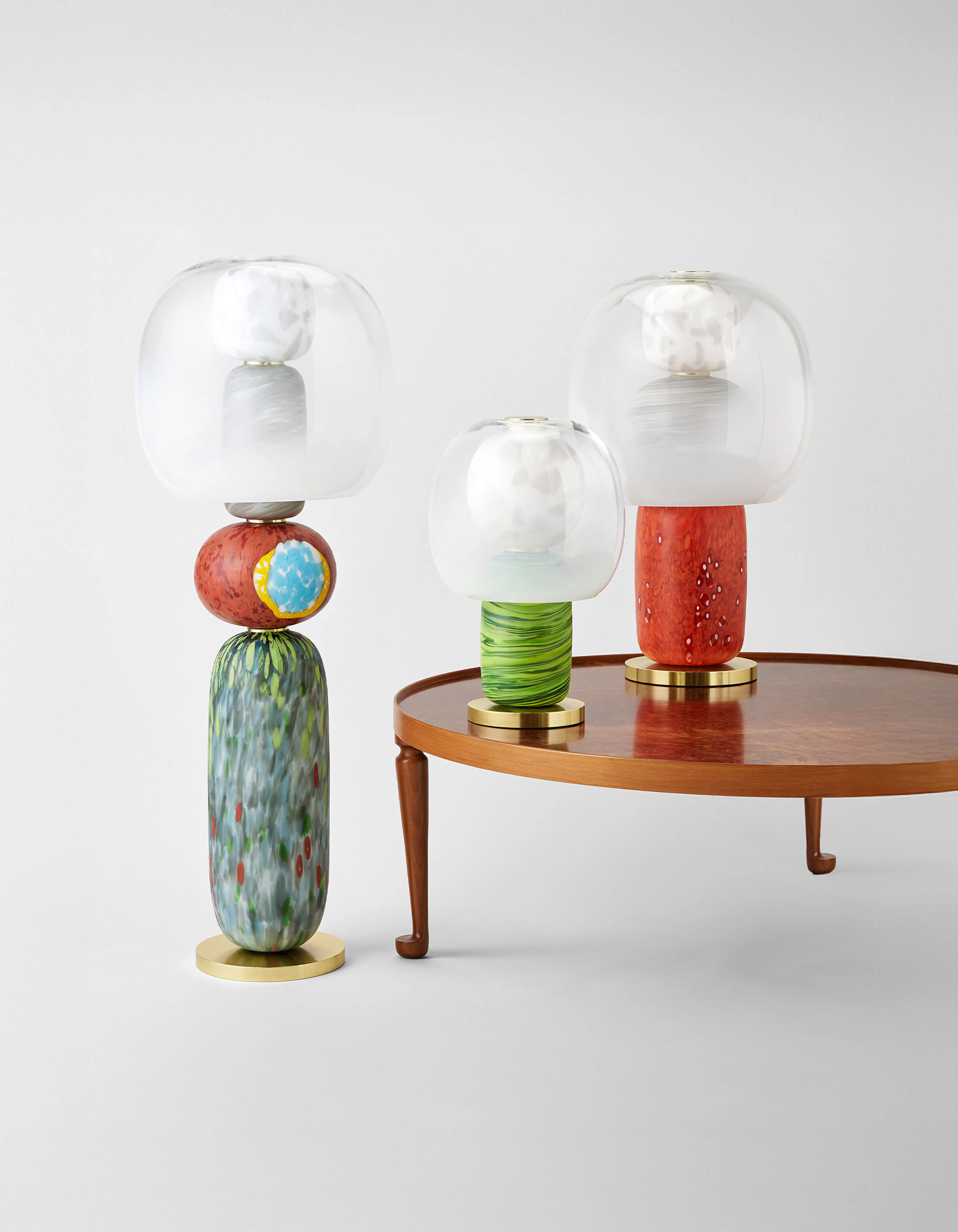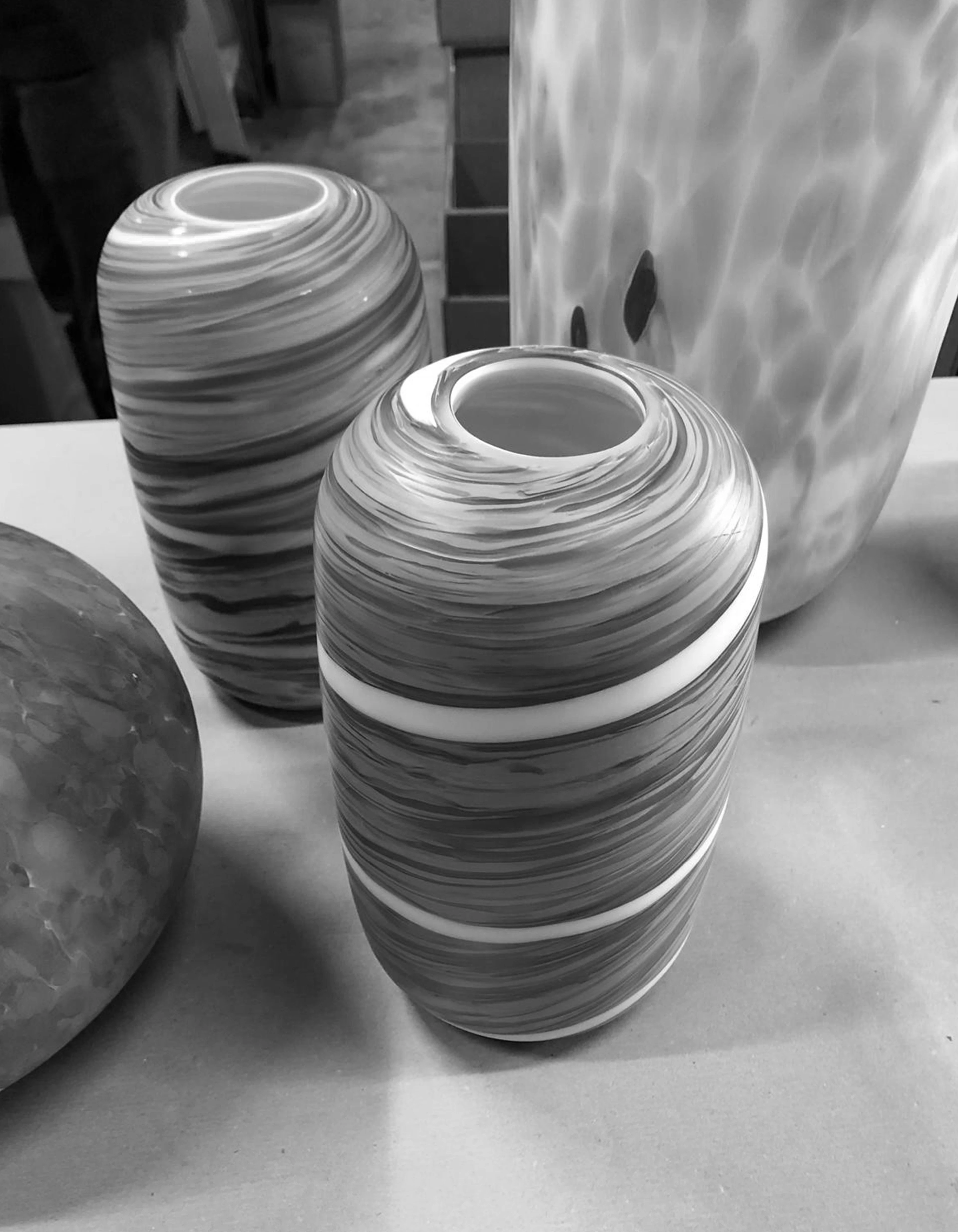 Below, a vertical sequence of Murano pebbles builds a totemic presence.
