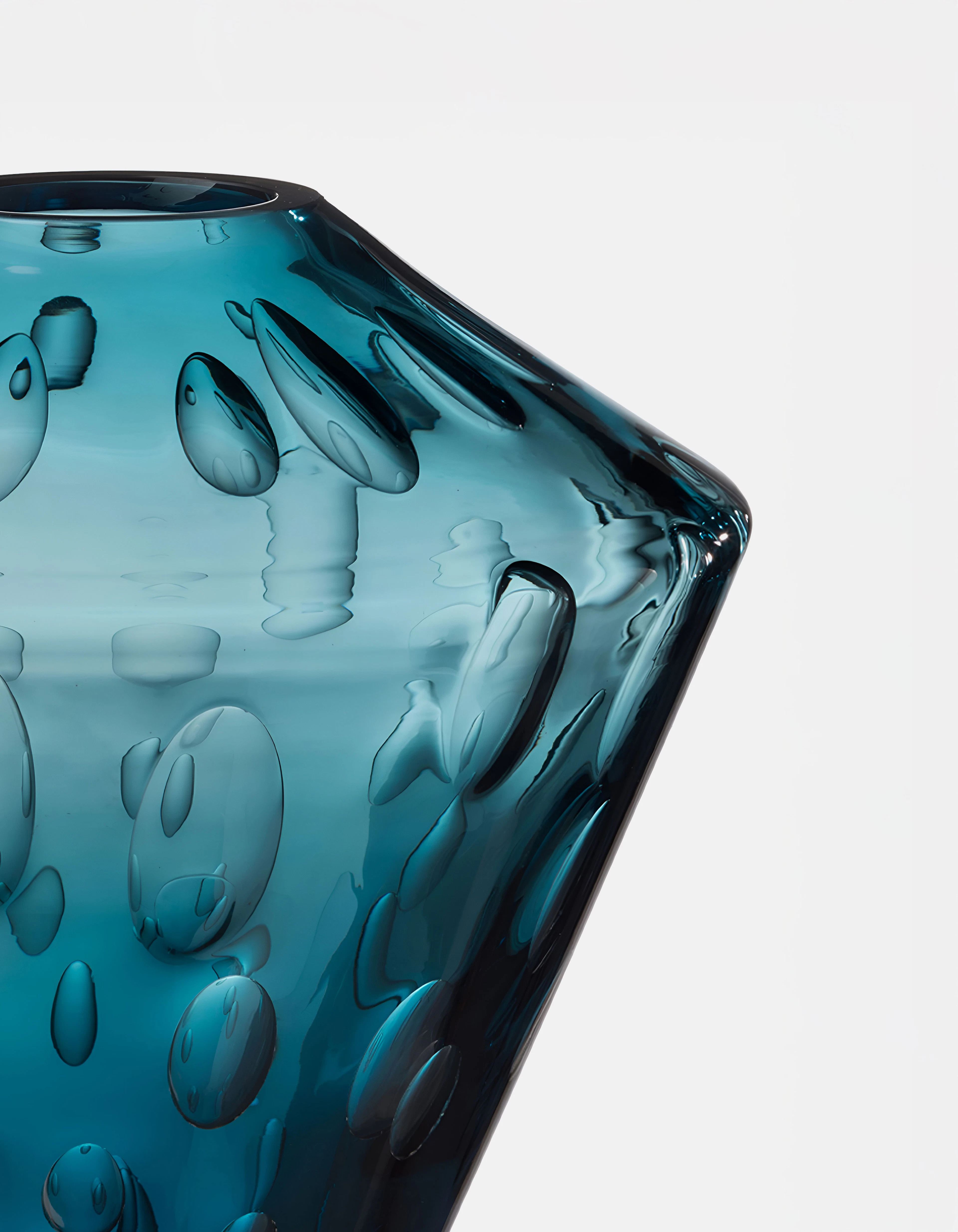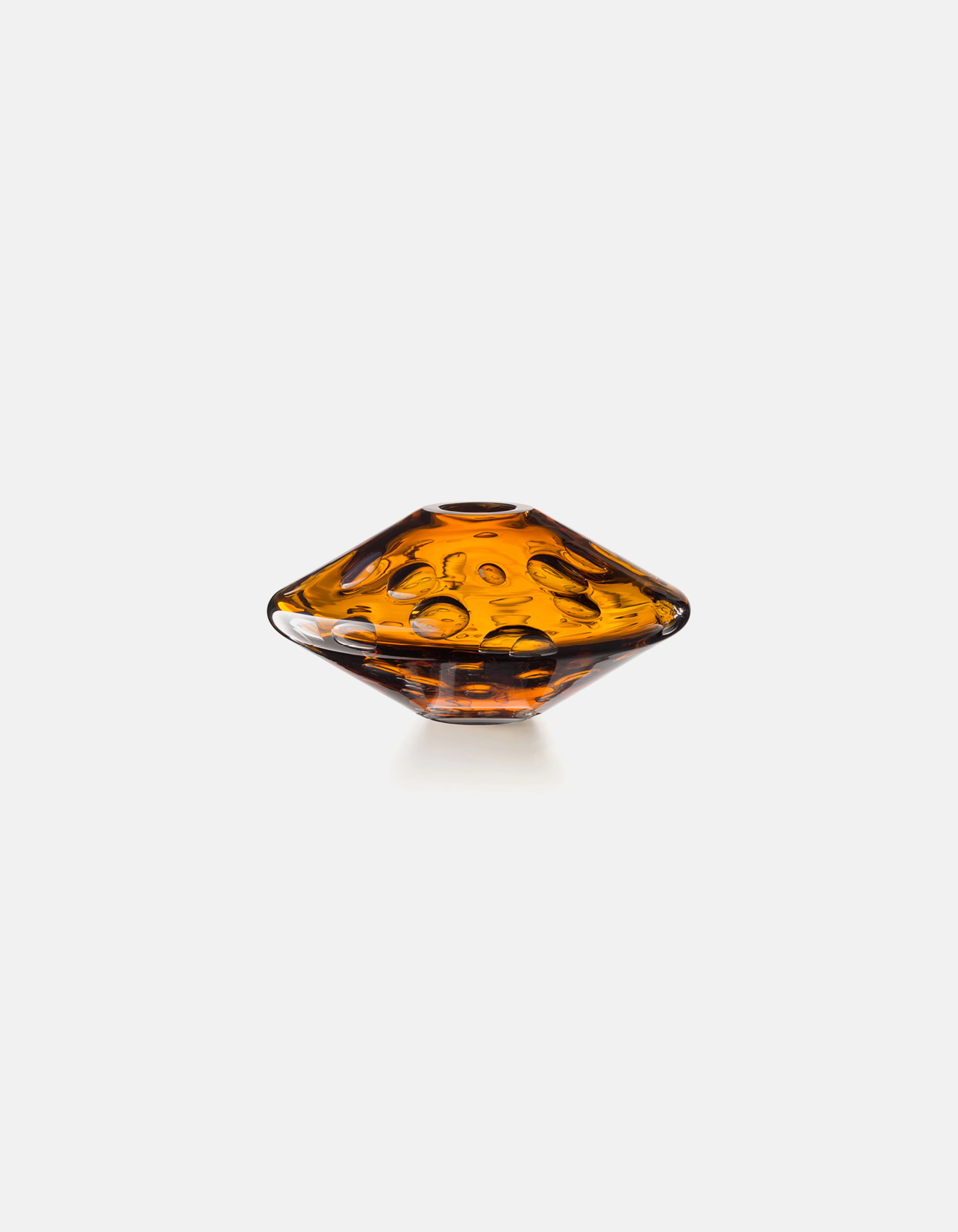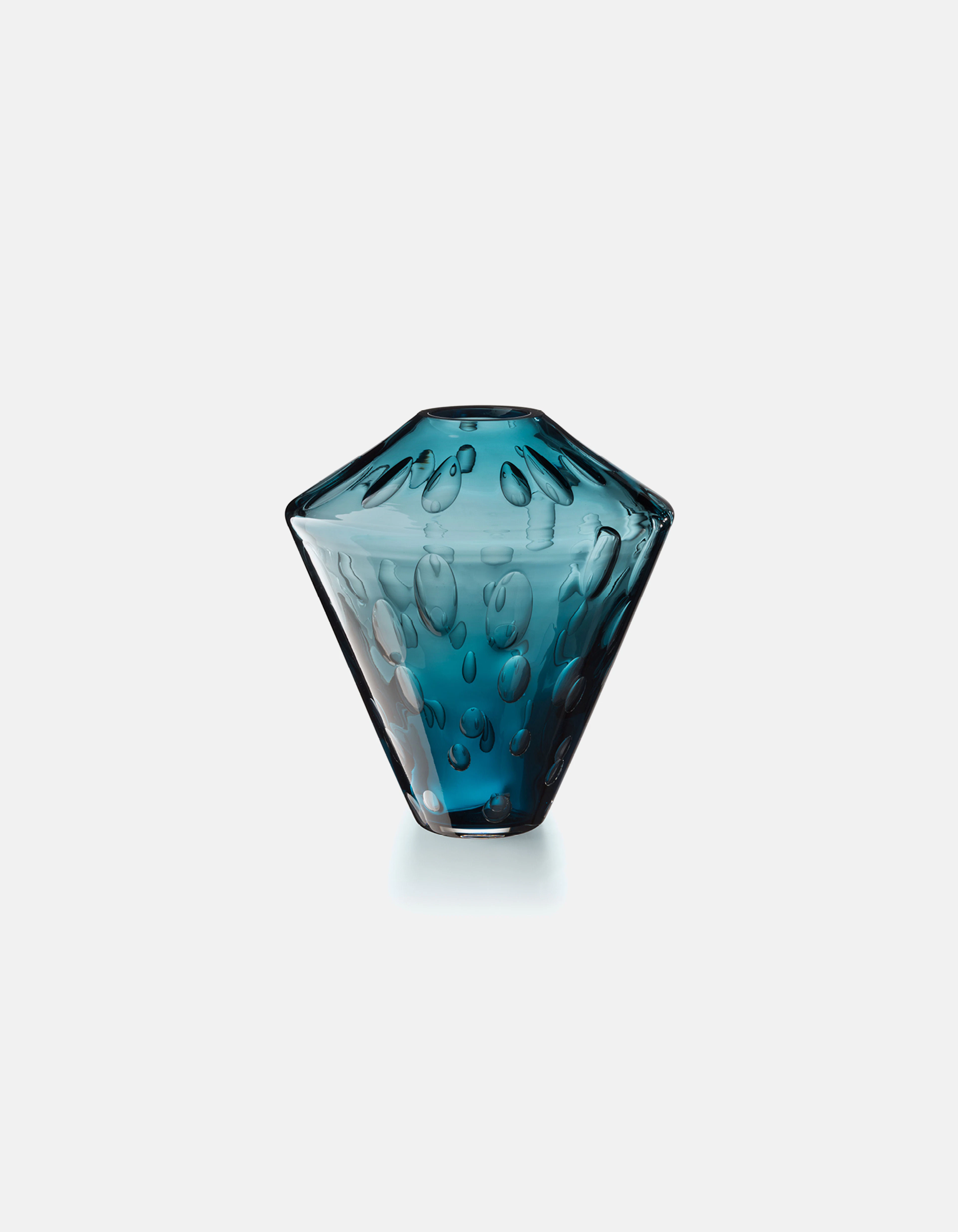 Each vase is crafted through a complex process in which large air bubbles are carefully trapped within molten glass. The artisan must maintain perfect timing and control so the bubbles remain suspended, forming the textured surface that defines every piece. Produced in three sizes, each vase holds its own constellation of air, transforming invisibility into shimmering depth.