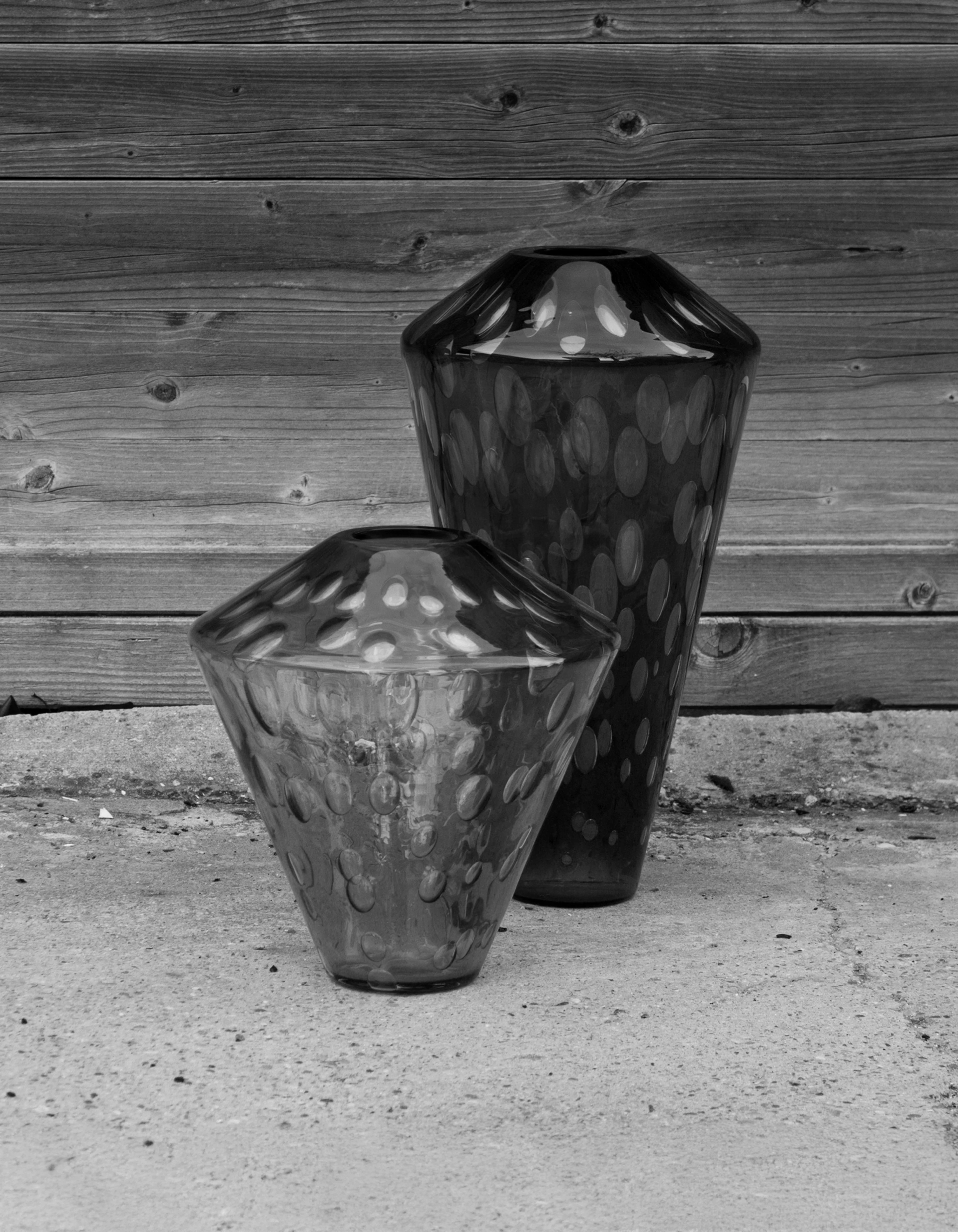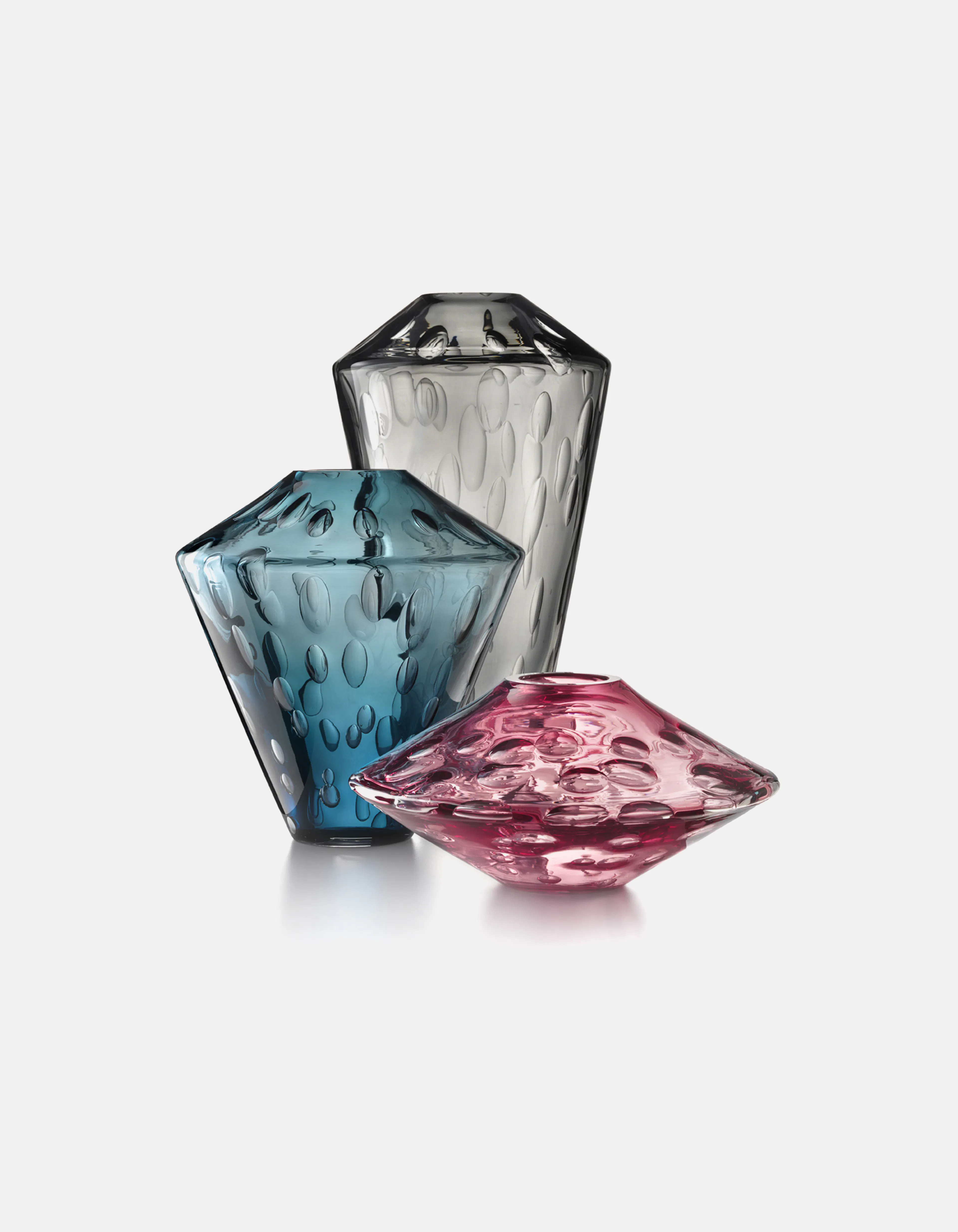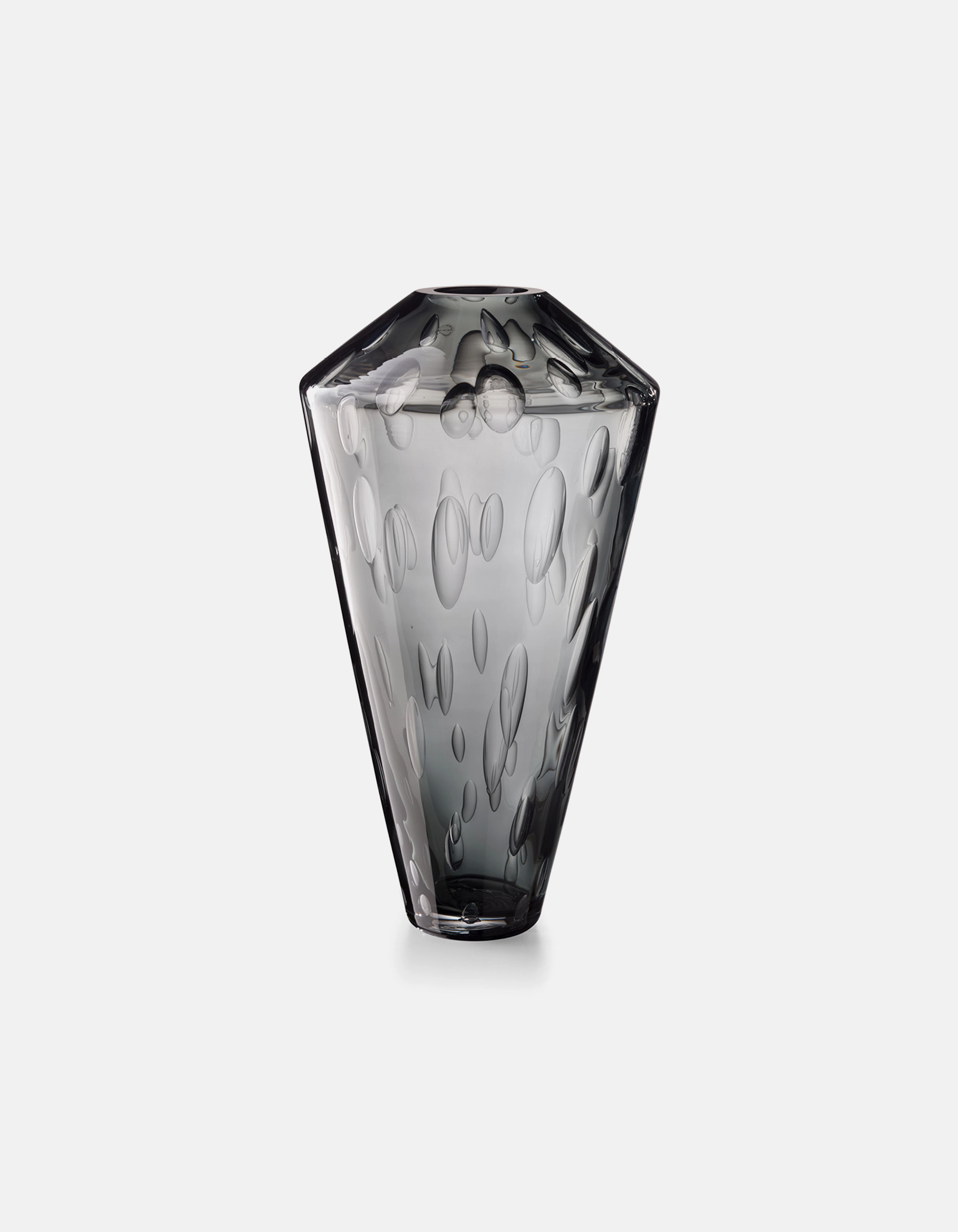 Each vase is crafted through a complex process in which large air bubbles are carefully trapped within molten glass. The artisan must maintain perfect timing and control so the bubbles remain suspended, forming the textured surface that defines every piece. Produced in three sizes, each vase holds its own constellation of air, transforming invisibility into shimmering depth.