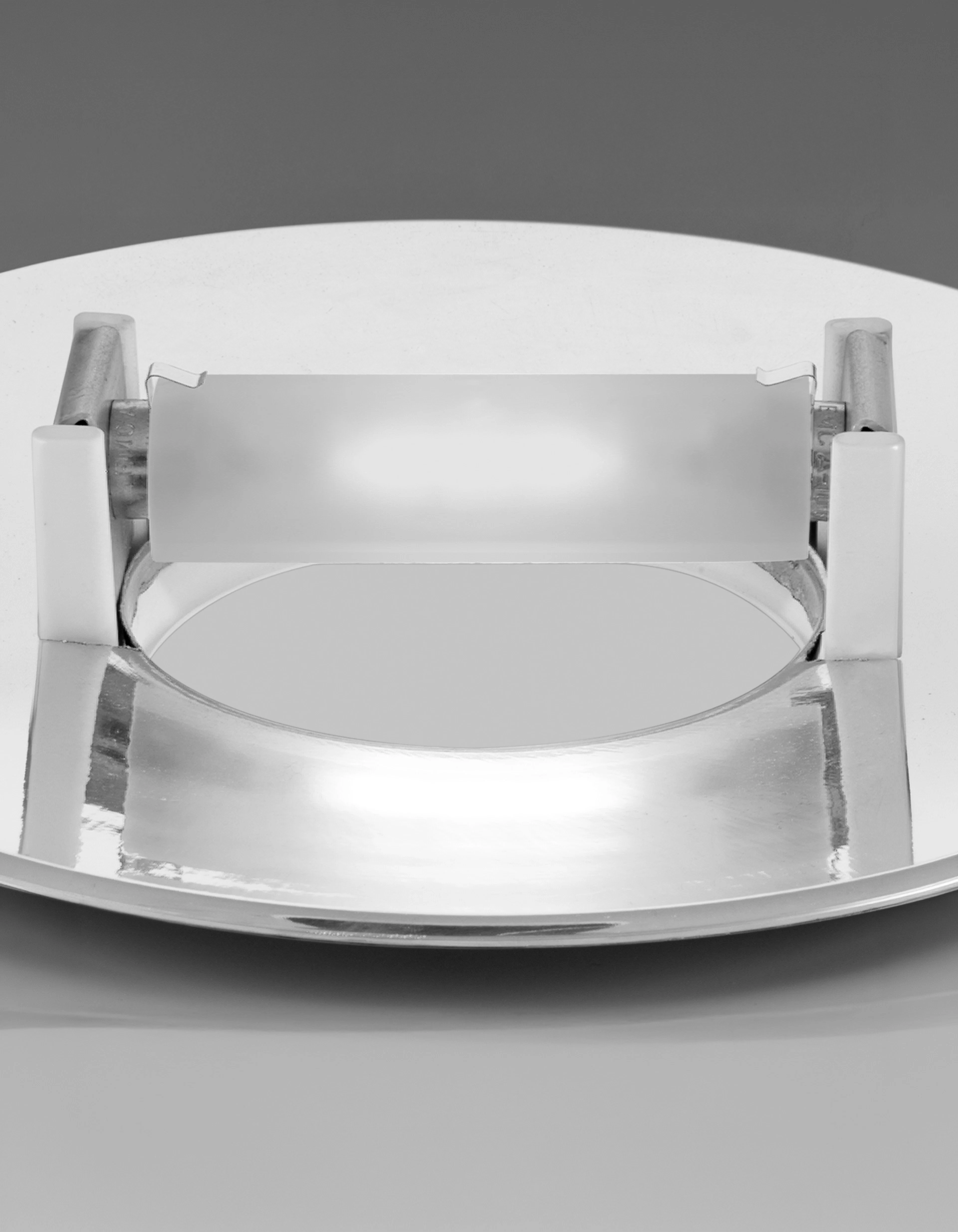 Its compressed oval silhouette, recalling the letter O, establishes dialogue between light and space. A single source at the base casts illumination downward while reflecting into the hollow core above. This interplay activates the interior void, diffusing a delicate glow outward. Rather than merely emitting light, O-Space shapes it, transforming geometry into atmosphere and presence.