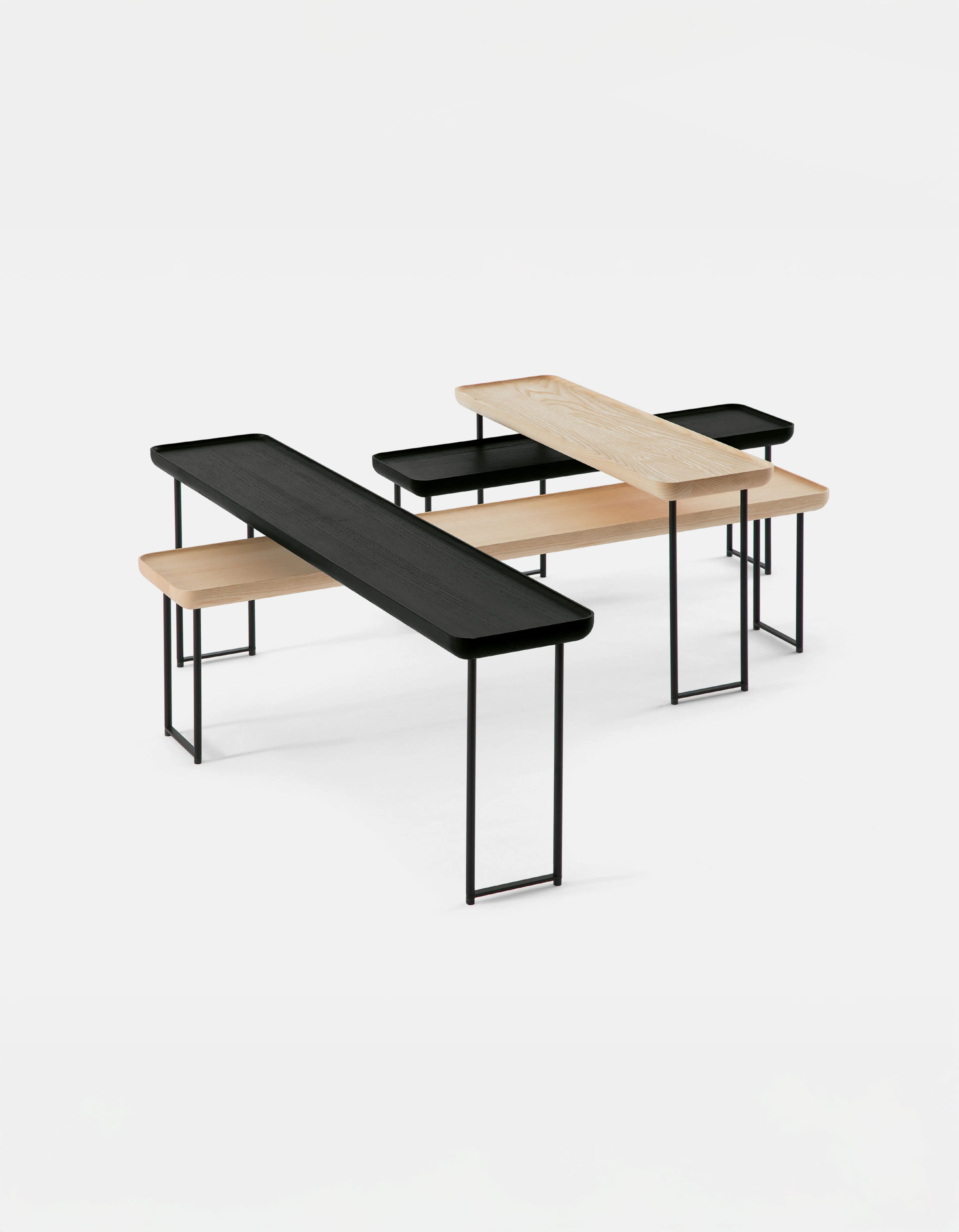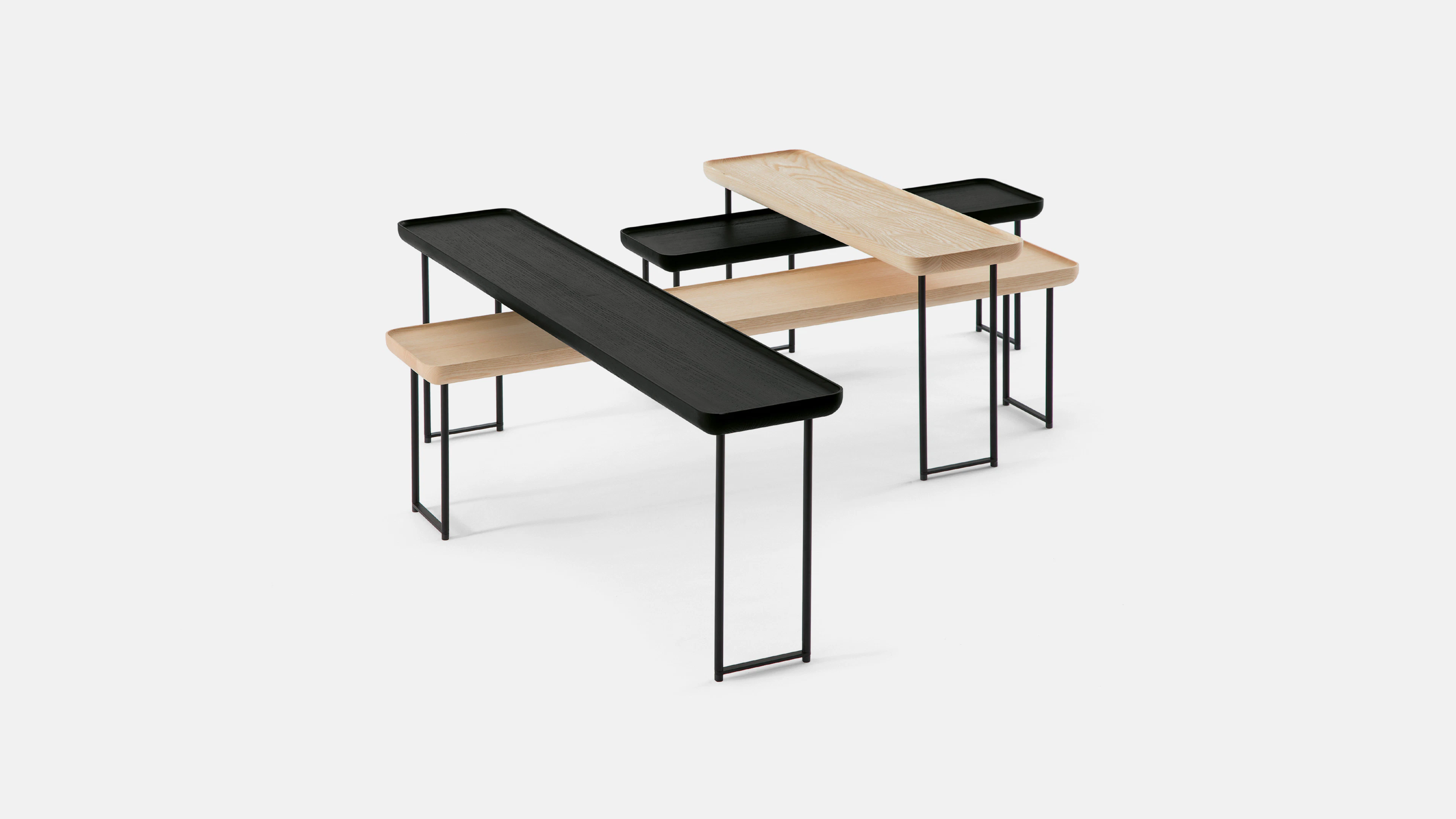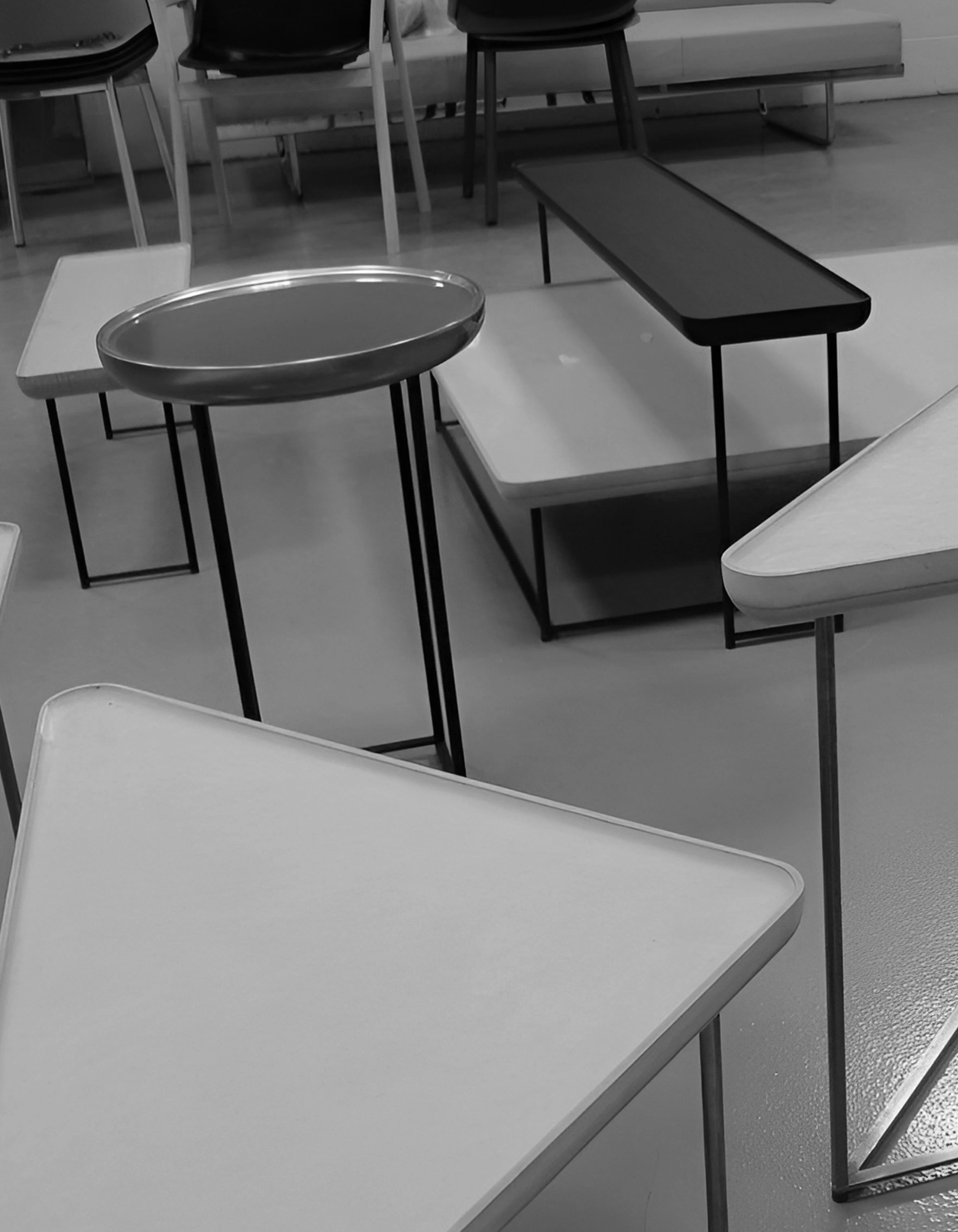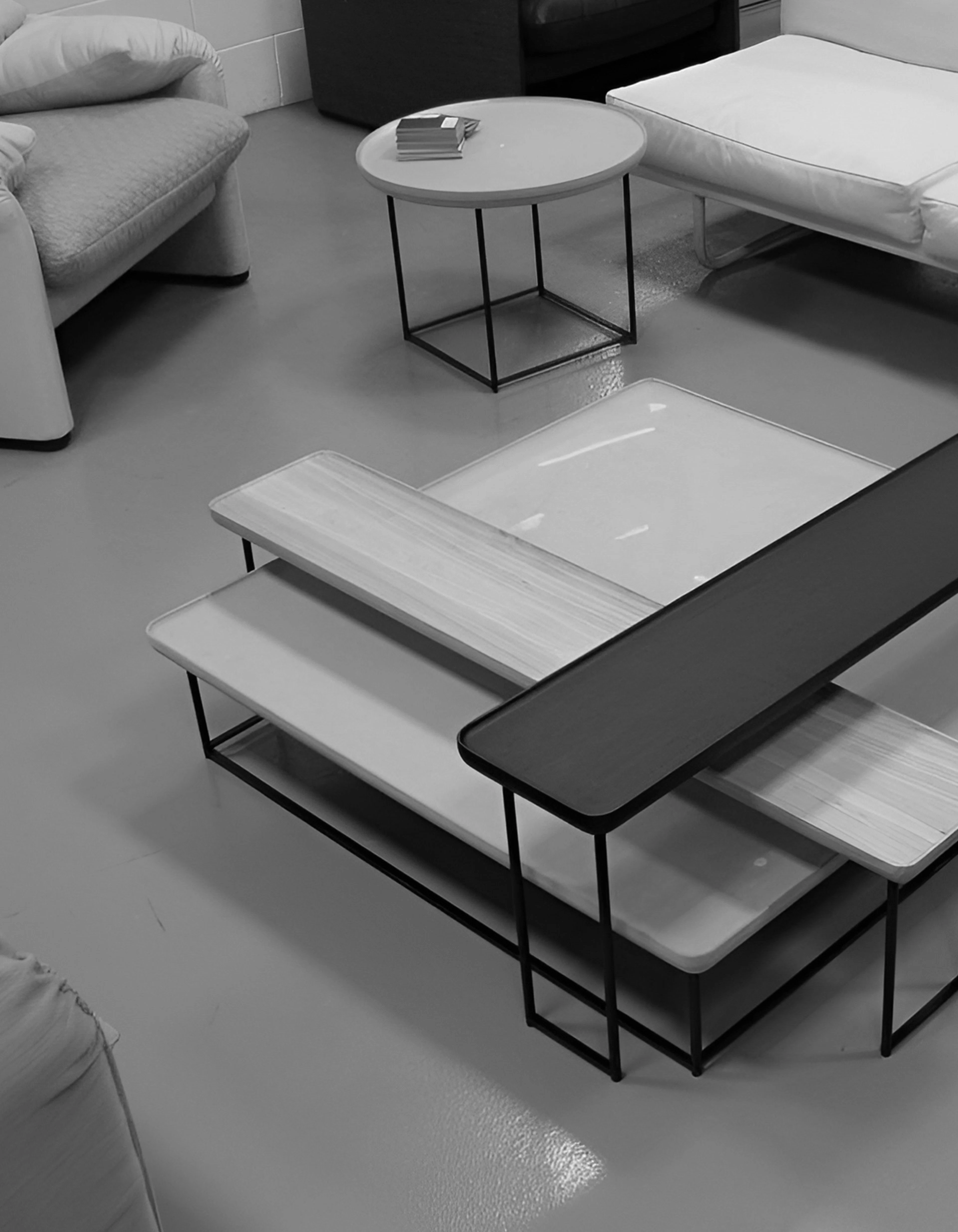 As the collection evolved, it retained its essential character while expanding its material and compositional range. The 2014 iteration introduced new finishes that paired slender metal legs with tops in ash wood and Carrara marble. The slightly folded edges of each surface evoked the precision of Japanese craftsmanship, adding a tactile sense of refinement to the clean geometry.