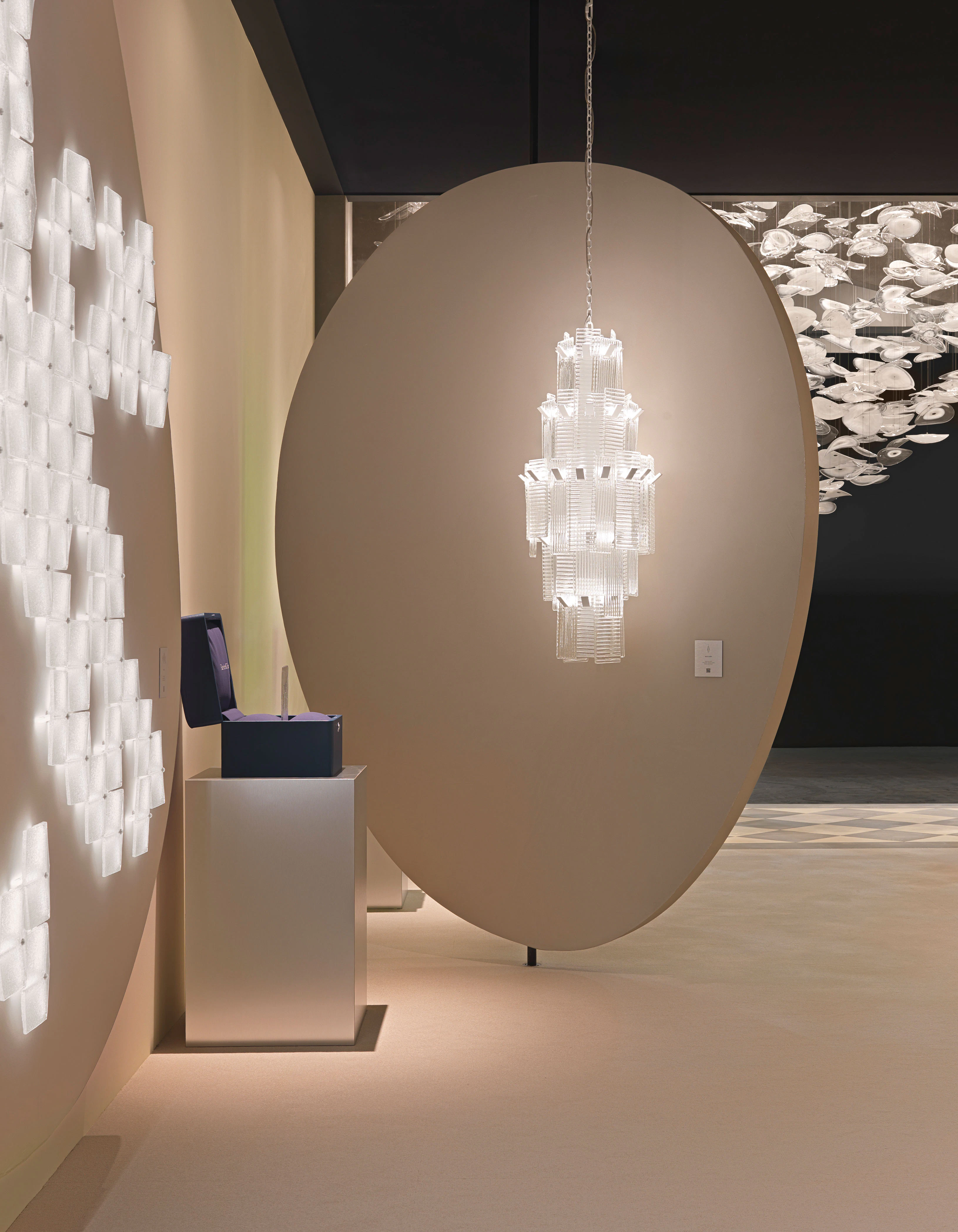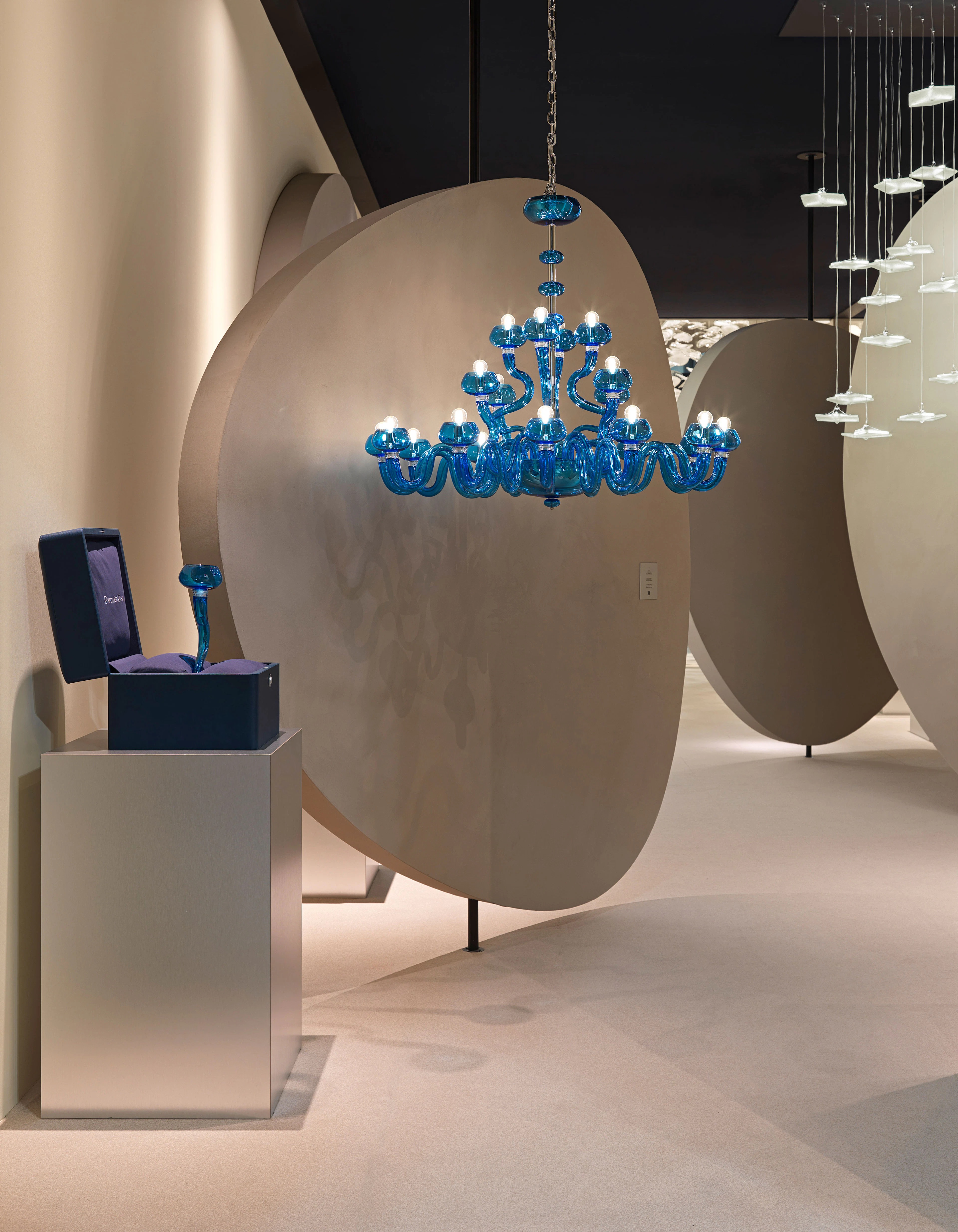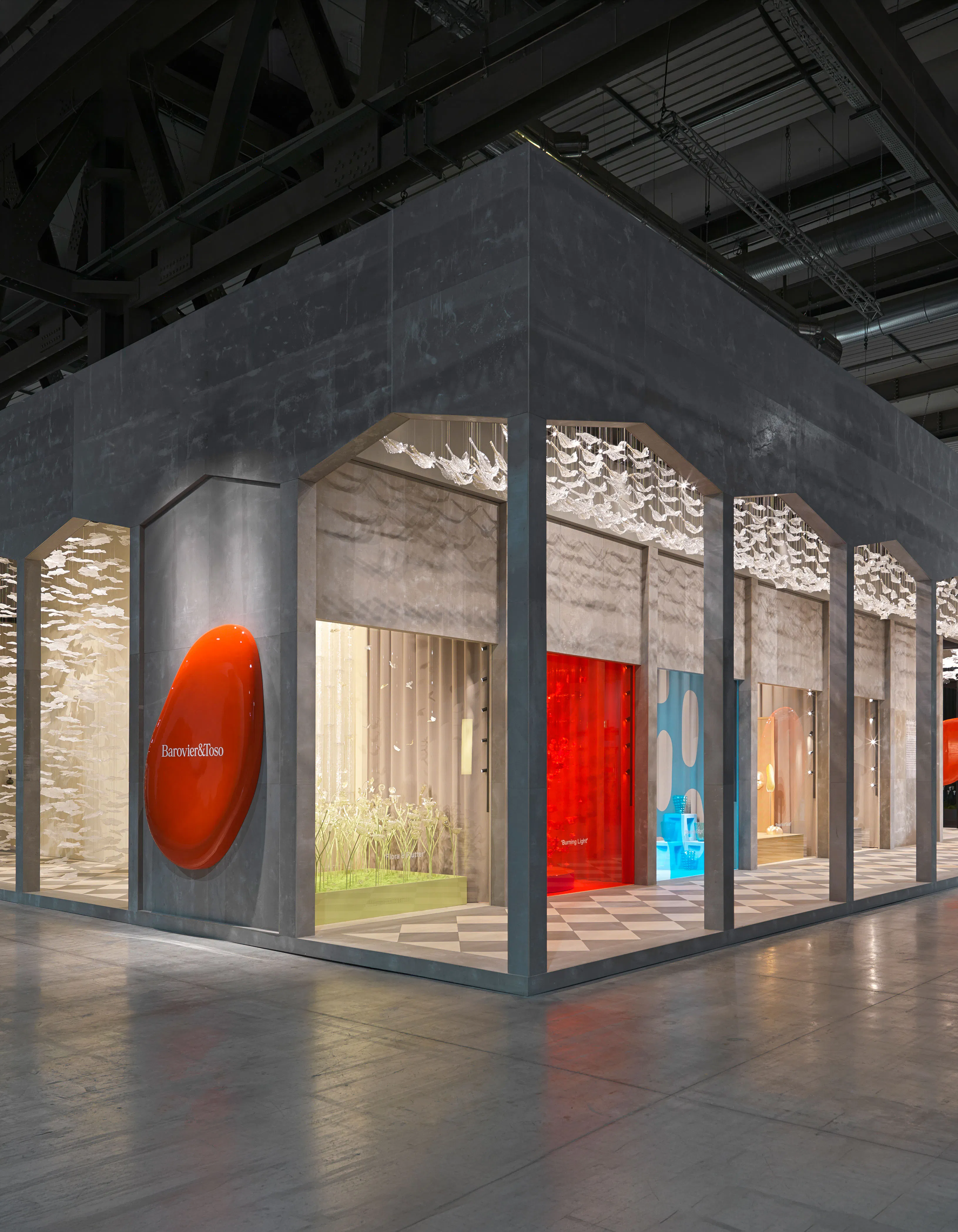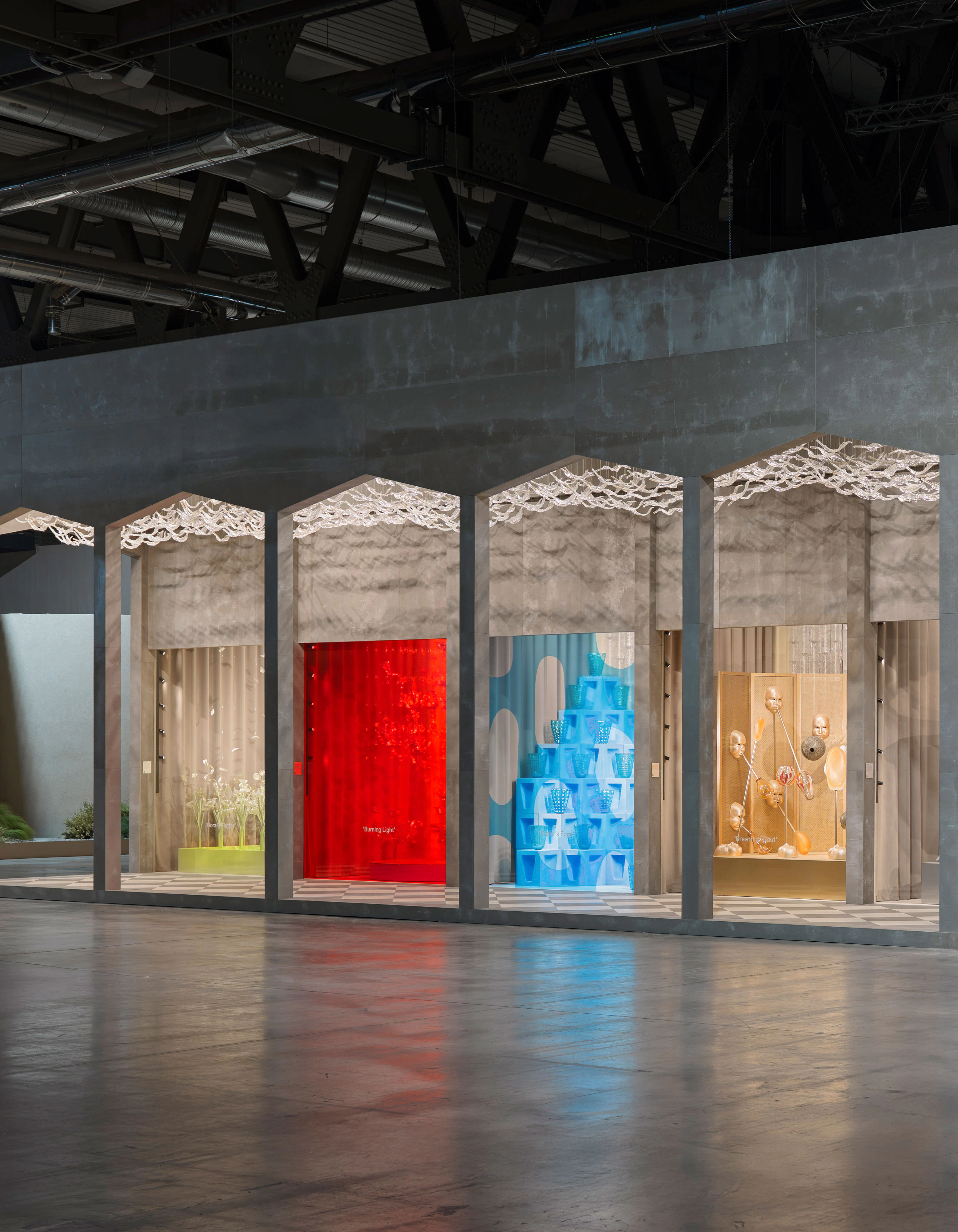 Presented at Euroluce, the installation became an immersive landscape evoking Venice through reflection, architecture, and color. Five thematic sceneries—Flora&Flutter, Burning Light, Water’s Edge, Breath of Gold, and Cups of Joy—interpreted glassmaking through vivid chromatic harmonies and tactile compositions. Deep cedar greens, fiery oranges, and navy blues recalled historic piazzas, while collections such as Agave and Midtown expressed technical mastery with contemporary clarity and expressive refinement.