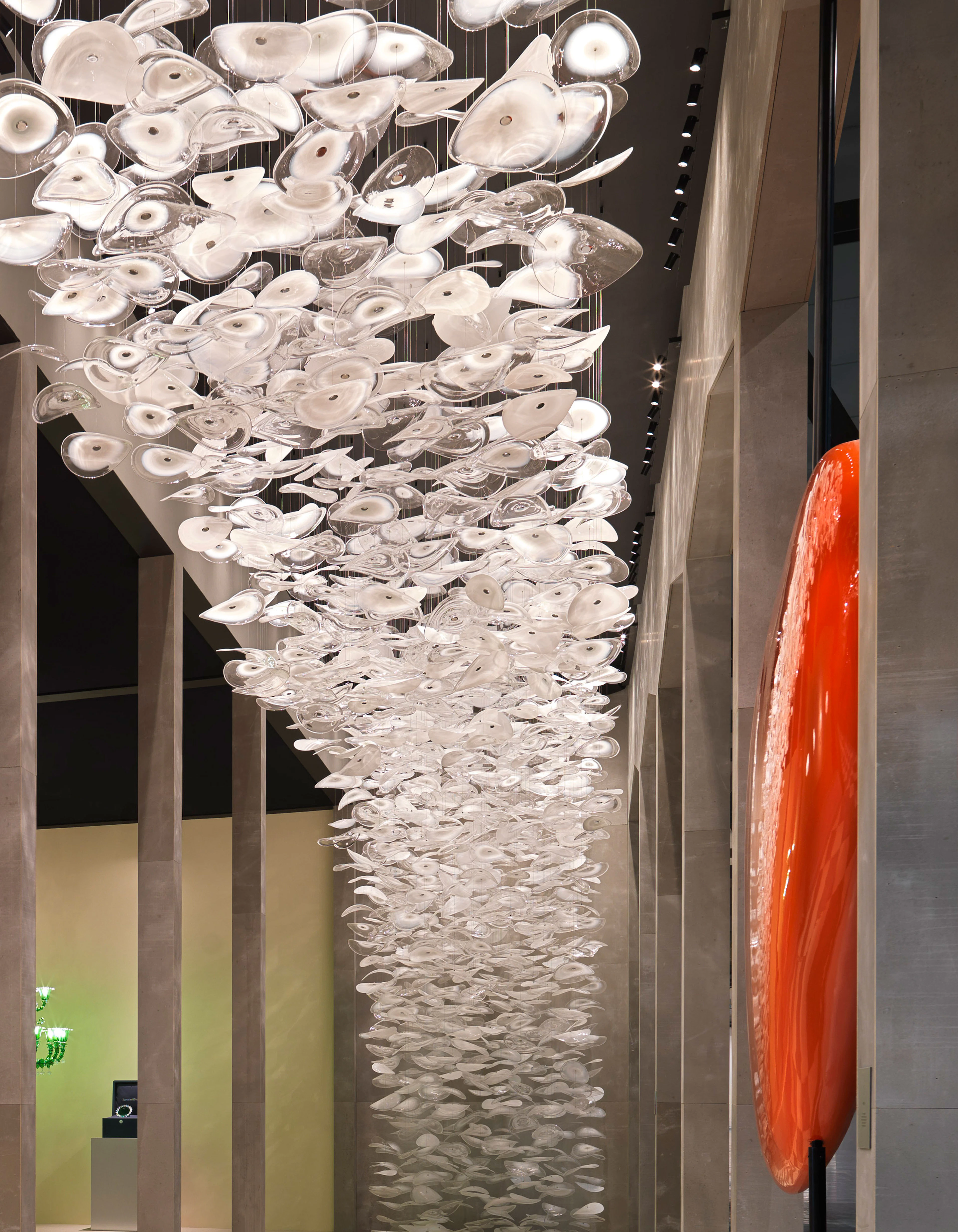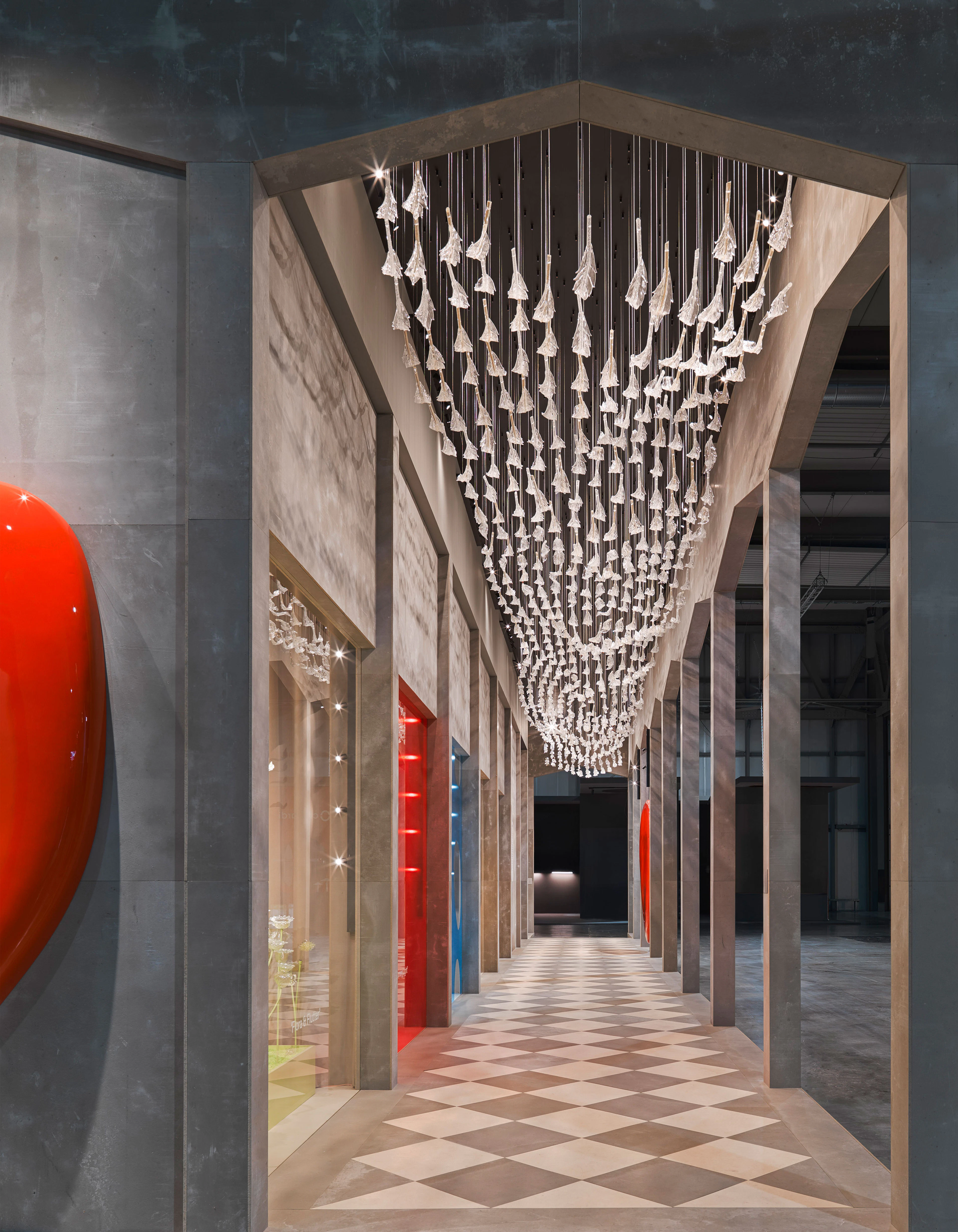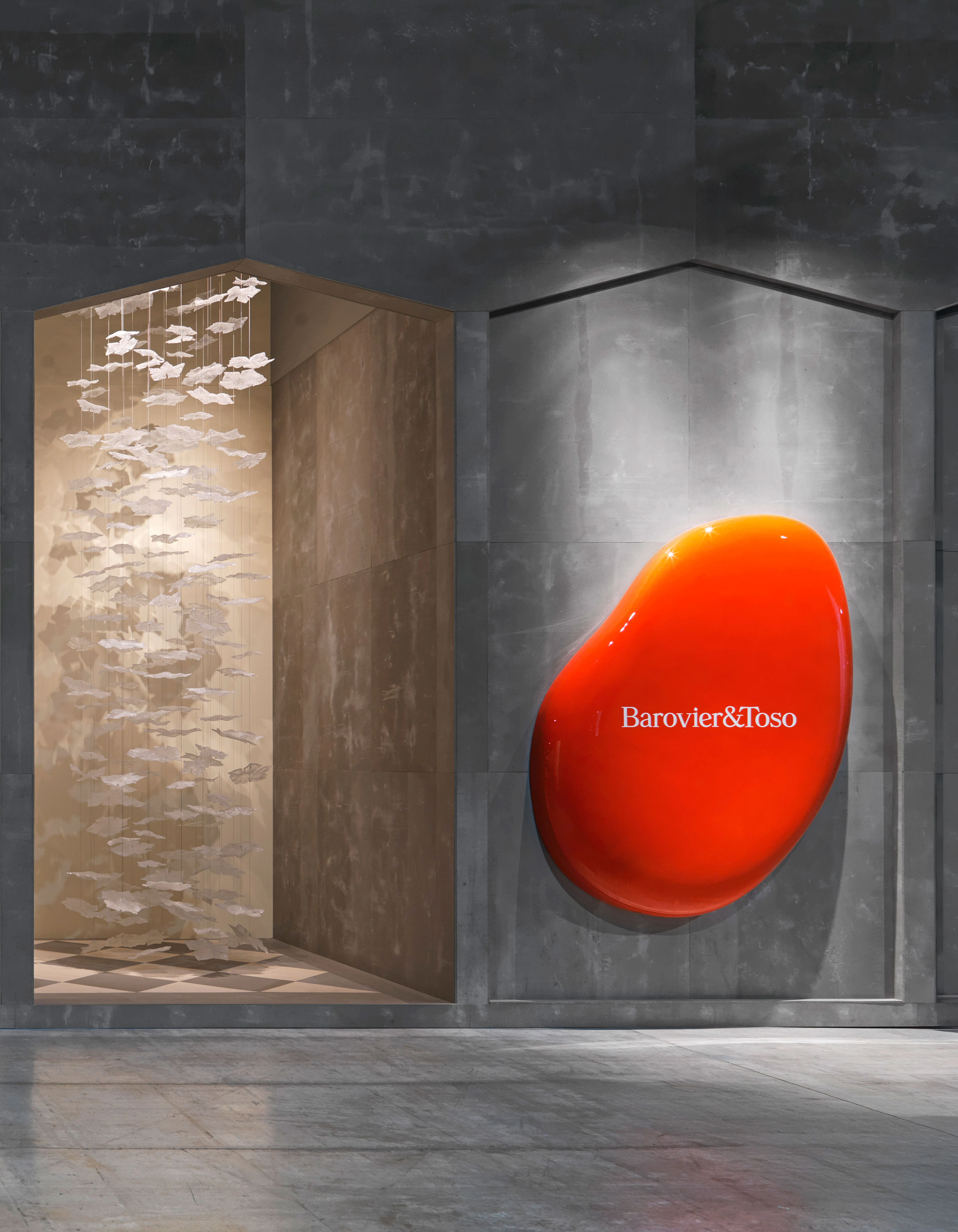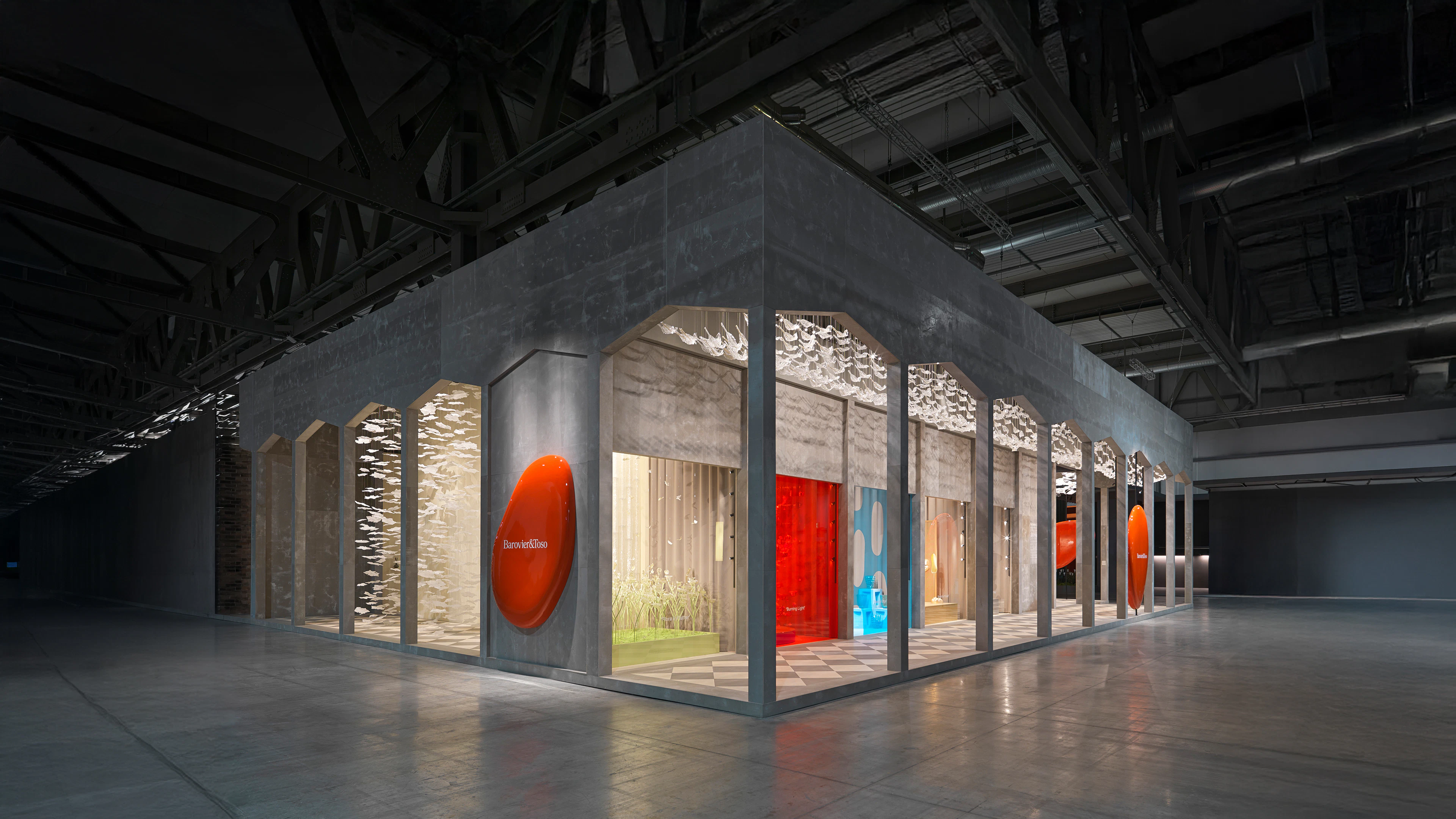 Presented at Euroluce, the installation became an immersive landscape evoking Venice through reflection, architecture, and color. Five thematic sceneries—Flora&Flutter, Burning Light, Water’s Edge, Breath of Gold, and Cups of Joy—interpreted glassmaking through vivid chromatic harmonies and tactile compositions. Deep cedar greens, fiery oranges, and navy blues recalled historic piazzas, while collections such as Agave and Midtown expressed technical mastery with contemporary clarity and expressive refinement.