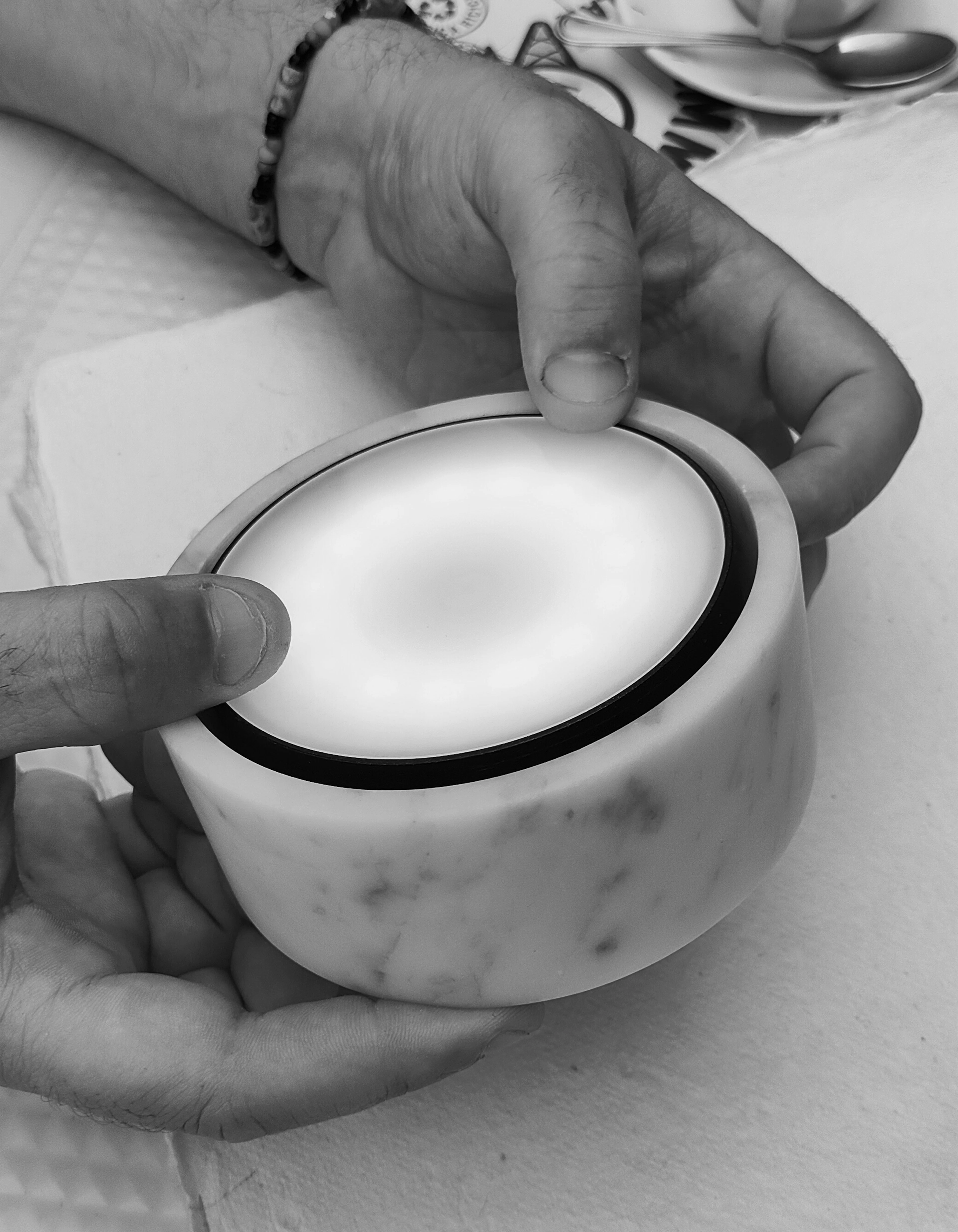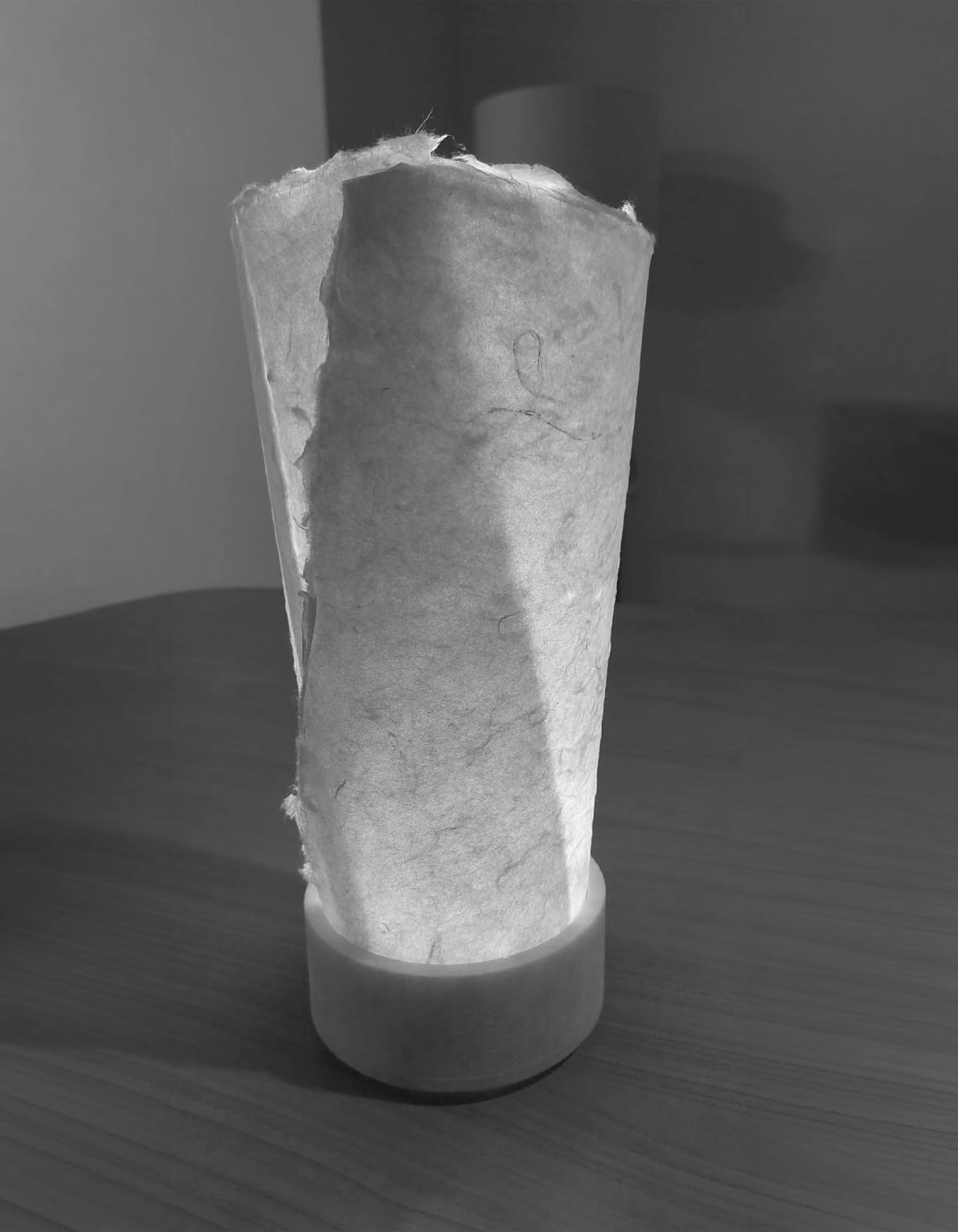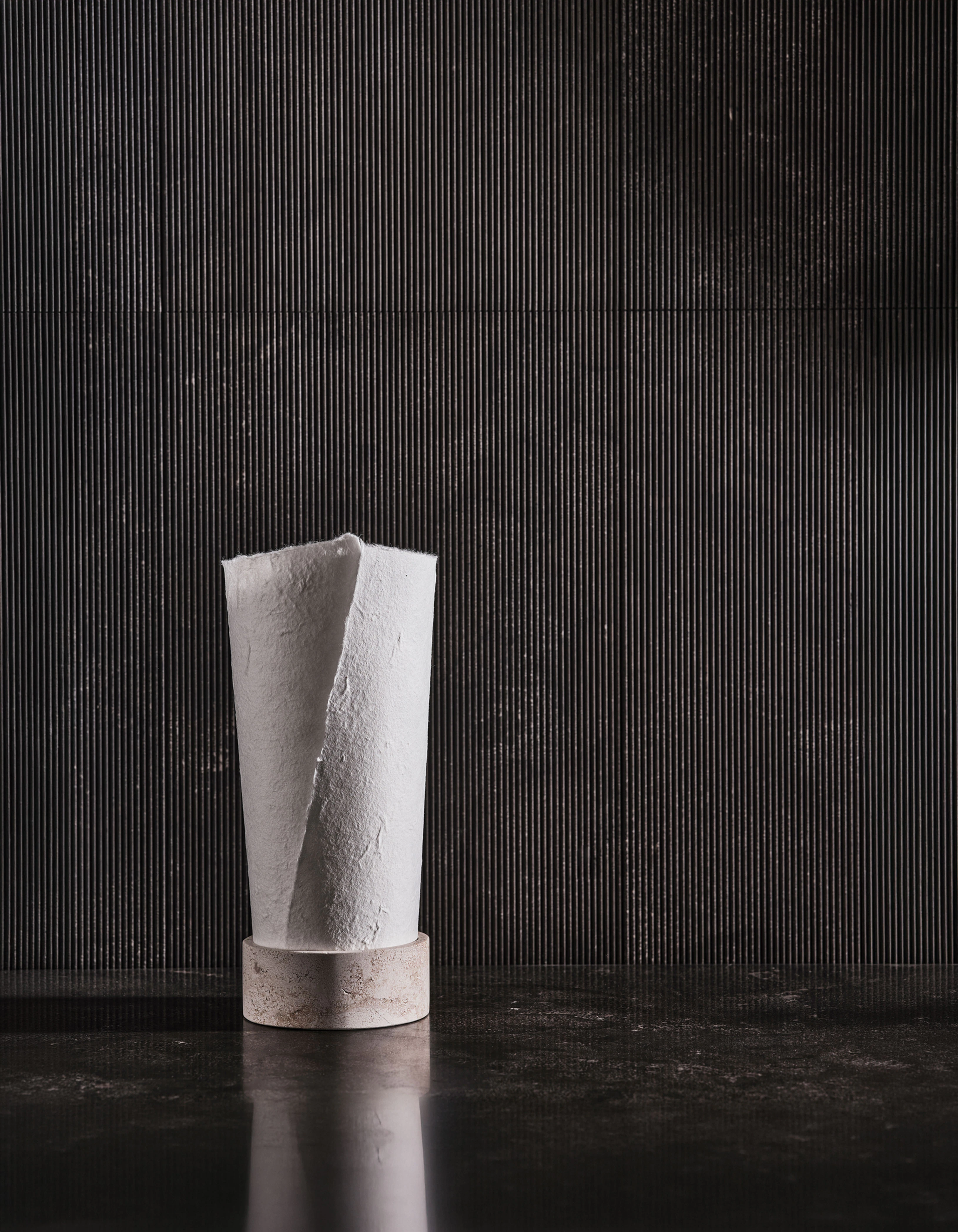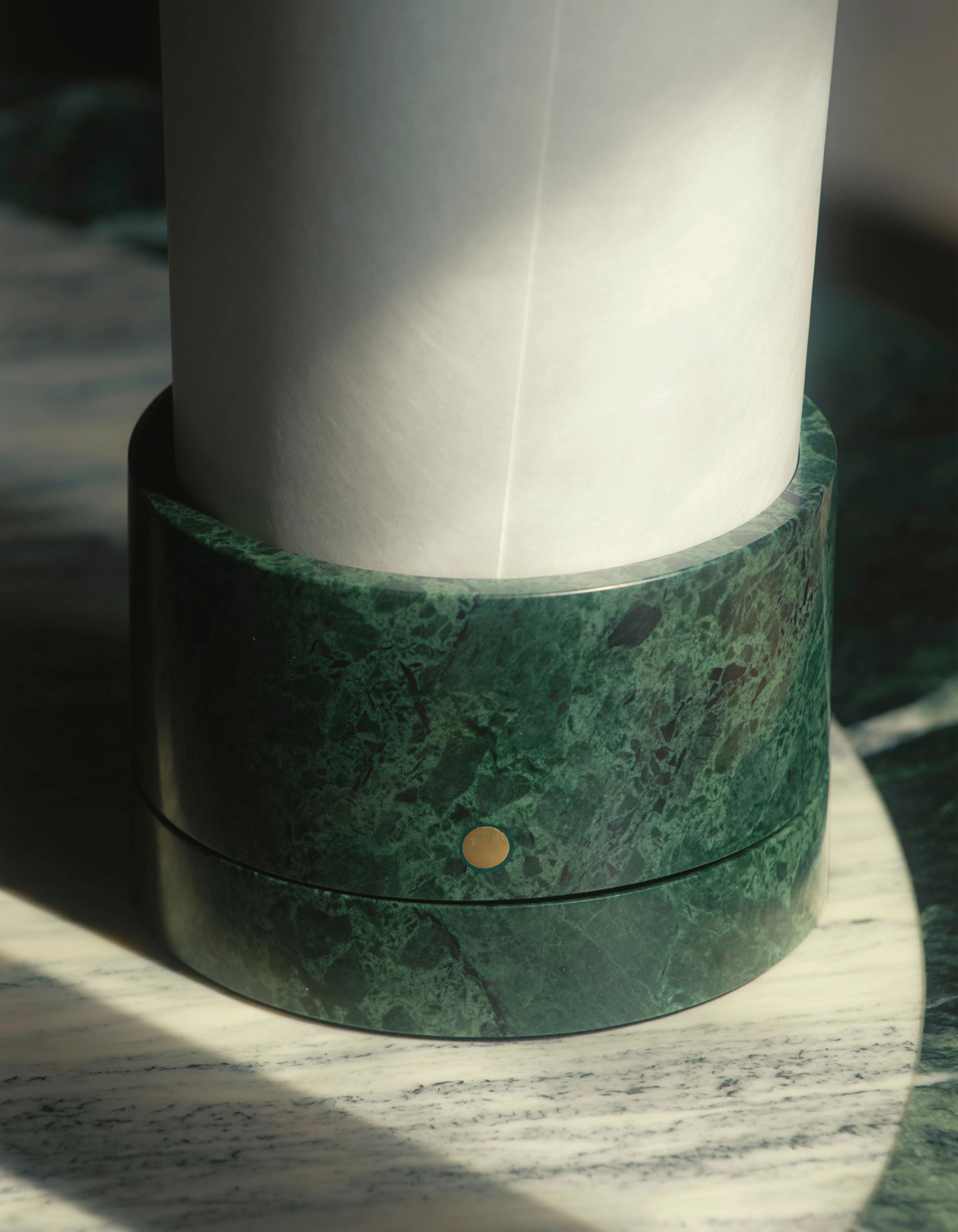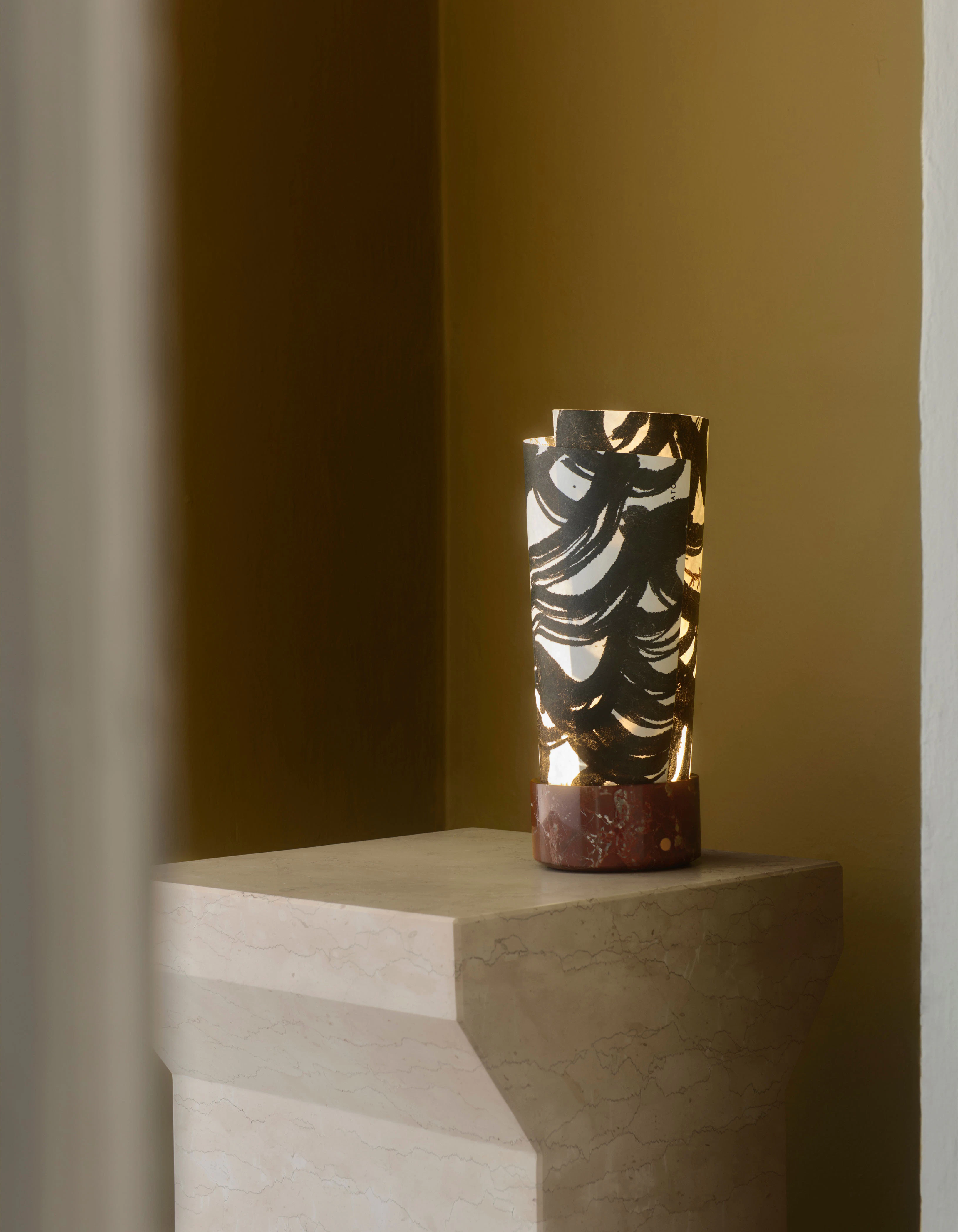 Defined by a simple, essential structure, Teo features a cylindrical marble base that integrates a dimmable LED light source. A rolled paper diffuser rises gently from the stone, casting a soft and enveloping glow. Each component reflects careful craftsmanship, allowing natural materials to speak with clarity and restraint. The dialogue between solid marble and weightless paper creates a serene presence, where technical precision enhances emotional warmth.