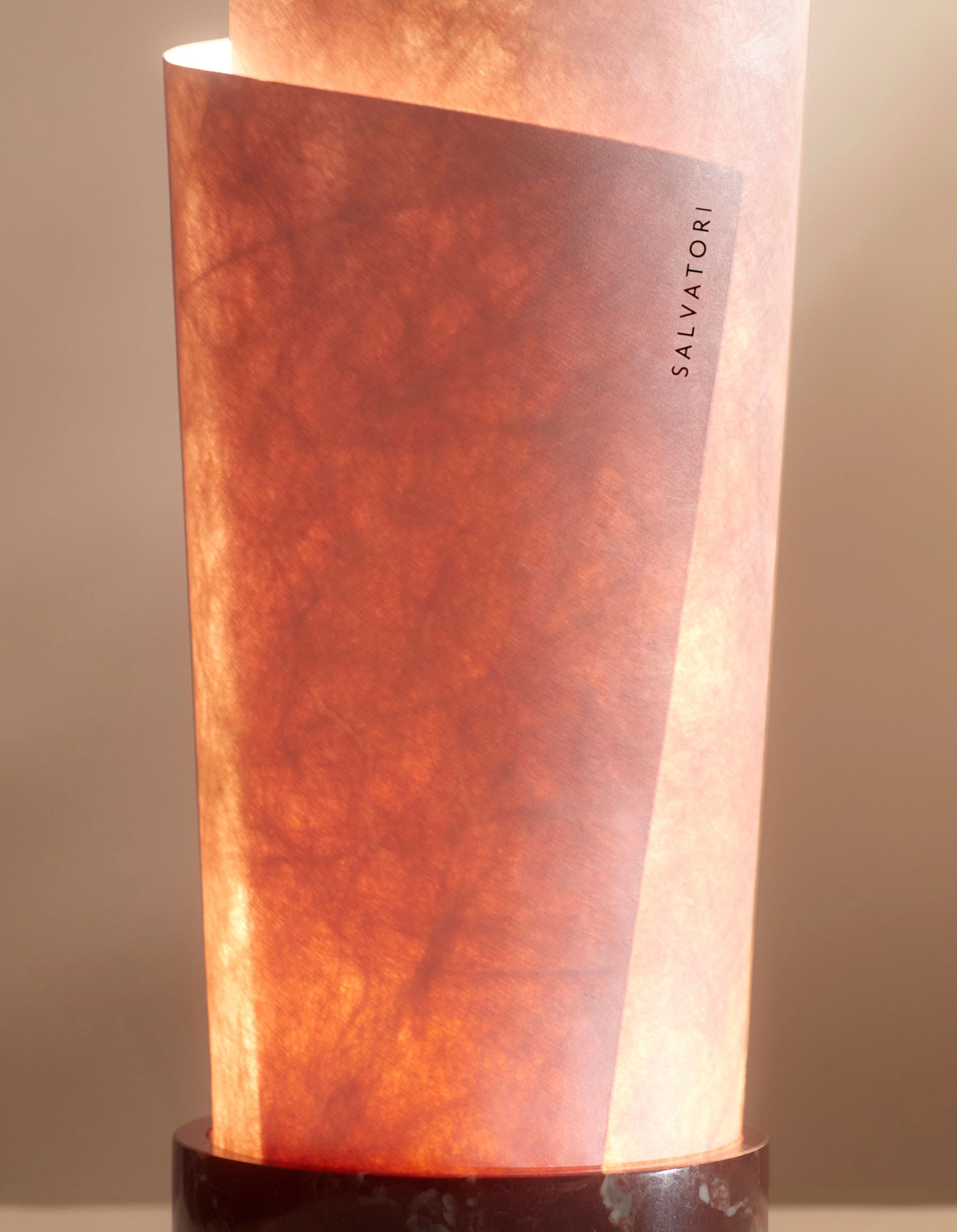 Teo is available in three marbles—Bianco Carrara, Rosso Levanto, and Verde Guatemala—each paired effortlessly with white or colored paper sheets. Every lamp includes five interchangeable sheets, inviting personal interpretation. Drawings, handwritten notes, or subtle imprints can transform the diffuser into a luminous keepsake. In this way, Teo becomes more than an object of illumination; it becomes a canvas for memory and individual expression.